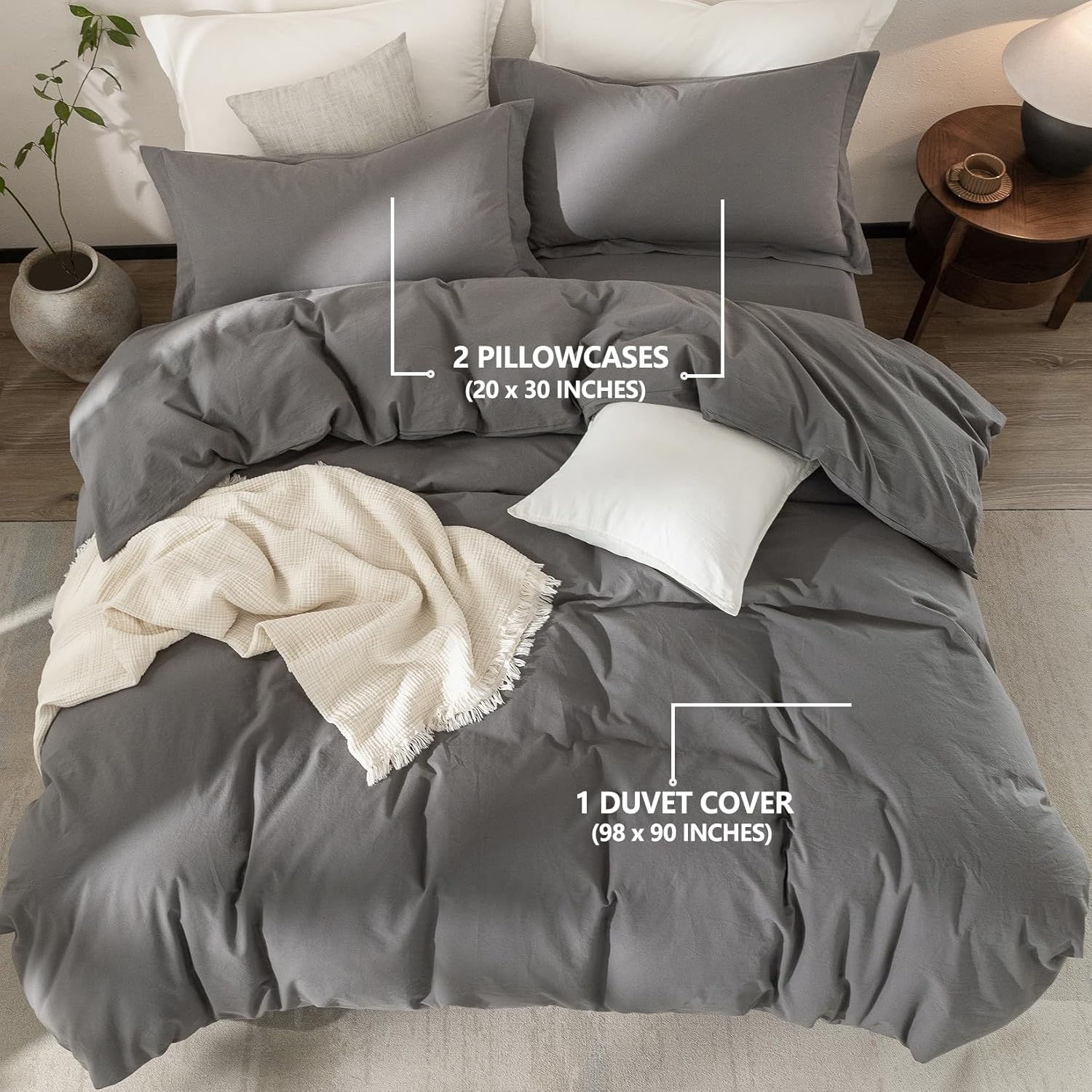 100% Washed Cotton Duvet Cover Super Queen Size Dark Grey Bedding Set Cover 1 Duvet Cover with Zipper Closure and 2 Pillowcases, 98inch x 90inch