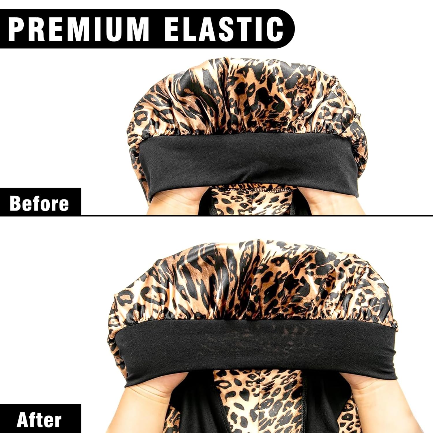 3Pcs Bonnets for Black Women Braids, Long Satin Bonnet with Stretchy Tie Band Sleep Cap for Long Hair (Purple & Leopard & Flower)