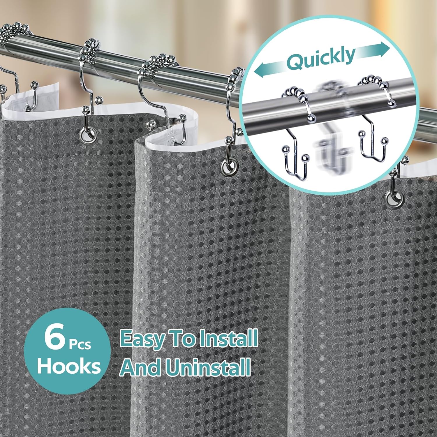 - Products Include: 1 Waffle Shower Curtain, 1 Shower Curtain Liner, 6 Double-sided Hooks. (Total 8 PCS)