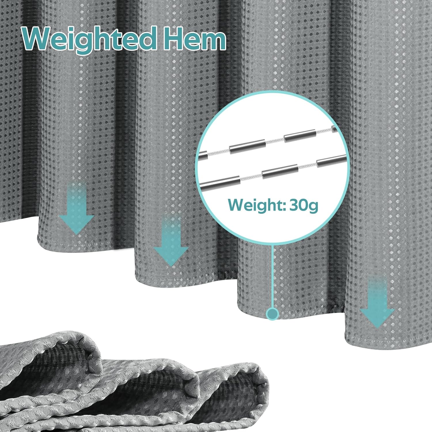 - High-Quality Polyester Fabric & Privacy Protection: Crafted from 258 GSM (grams per square meter) high-quality polyester fabric, it is fabric is thick yet allows good translucency, it is 1.12 pounds heavier than the 90 GSM fabric shower curtain. The added 30g weighted hem prevents the shower curtain from floating, ensuring enhanced privacy protection for you. The waffle weave pattern adds a touch of luxury and elegance to your bathroom