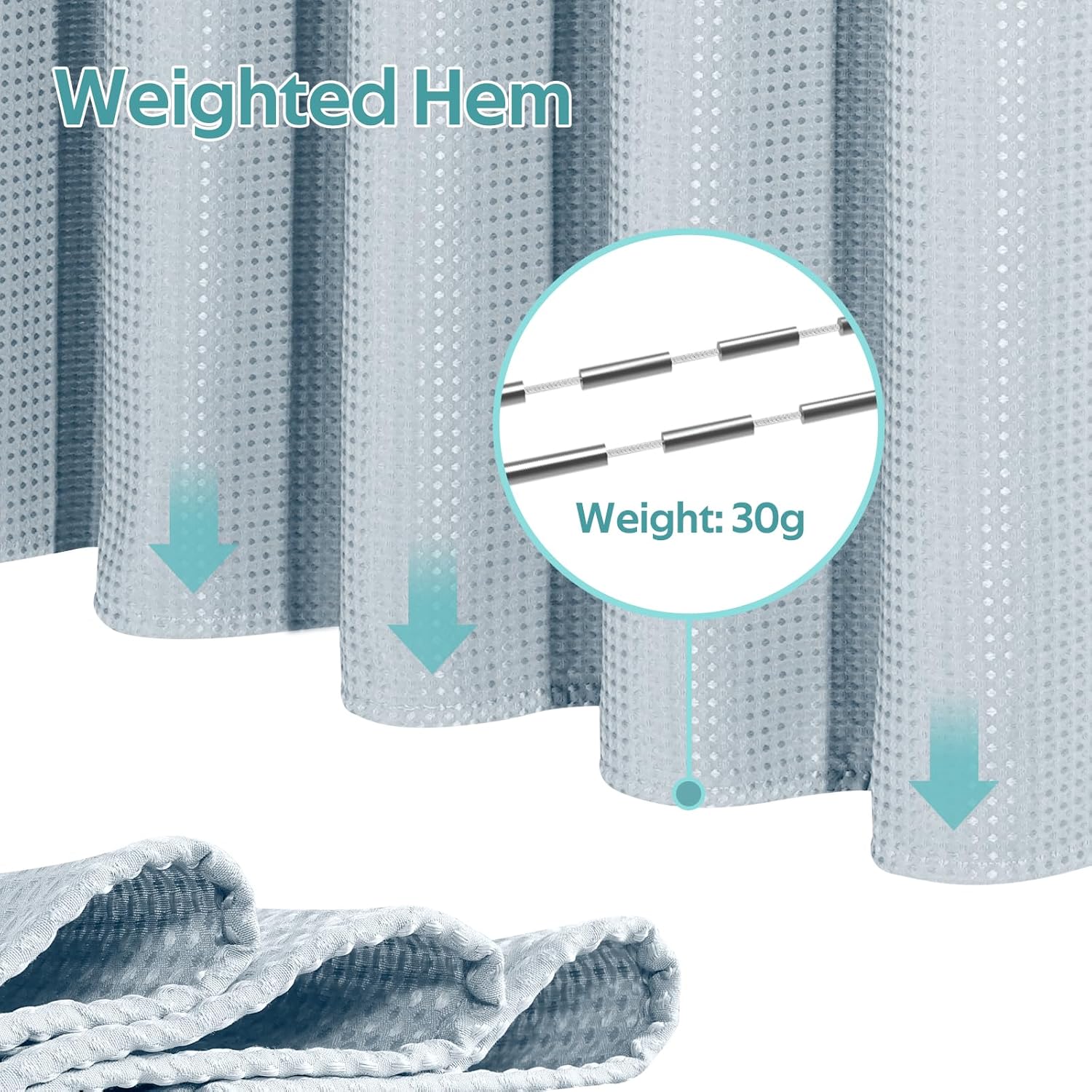 - High-Quality Polyester Fabric & Privacy Protection: Crafted from 258 GSM (grams per square meter) high-quality polyester fabric, it is fabric is thick yet allows good translucency, it is 1.12 pounds heavier than the 90 GSM fabric shower curtain. The added 30g weighted hem prevents the shower curtain from floating, ensuring enhanced privacy protection for you. The waffle weave pattern adds a touch of luxury and elegance to your bathroom