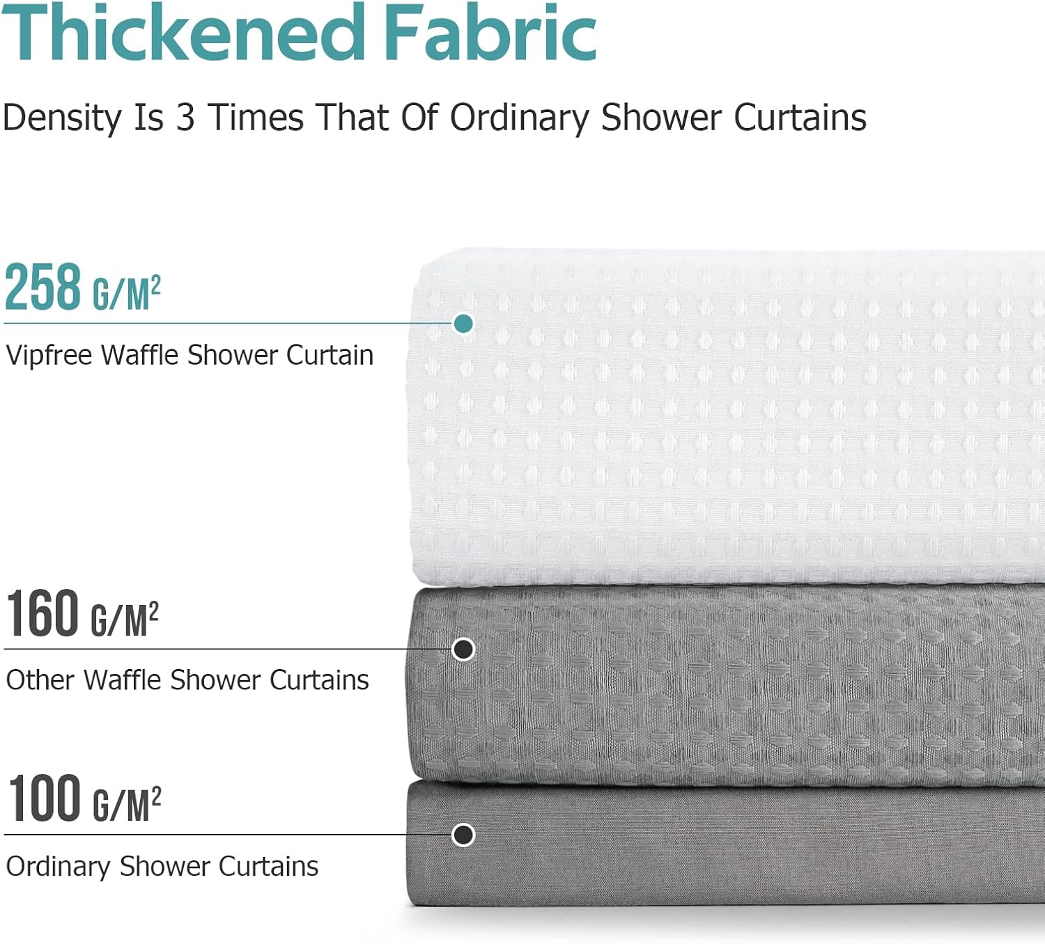 - High-Quality Polyester Fabric & Privacy Protection: Crafted from 258 GSM (grams per square meter) high-quality polyester fabric, it is fabric is thick yet allows good translucency, it is 1.12 pounds heavier than the 90 GSM fabric shower curtain. The added 30g weighted hem prevents the shower curtain from floating, ensuring enhanced privacy protection for you. The waffle weave pattern adds a touch of luxury and elegance to your bathroom