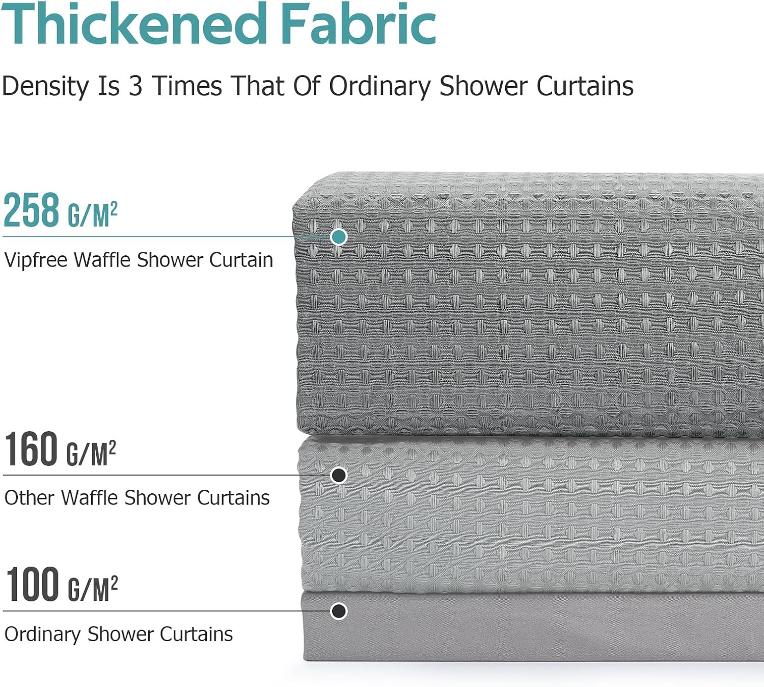 - High-Quality Polyester Fabric & Privacy Protection: Crafted from 258 GSM (grams per square meter) high-quality polyester fabric, it is fabric is thick yet allows good translucency, it is 1.12 pounds heavier than the 90 GSM fabric shower curtain. The added 30g weighted hem prevents the shower curtain from floating, ensuring enhanced privacy protection for you. The waffle weave pattern adds a touch of luxury and elegance to your bathroom