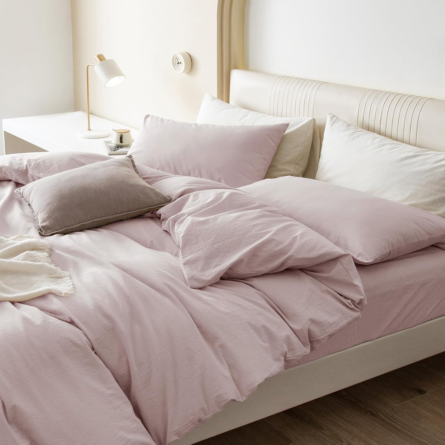 JIYUAN 100% Washed Cotton Duvet Cover Set 3 Pieces Cal King, 1 Duvet Cover 104x98 Inches (Comforter Not Included) and 2 Pillowcases,Linen Feel Bedding Set Comfy and Breathable, Heathered Greyish Pink