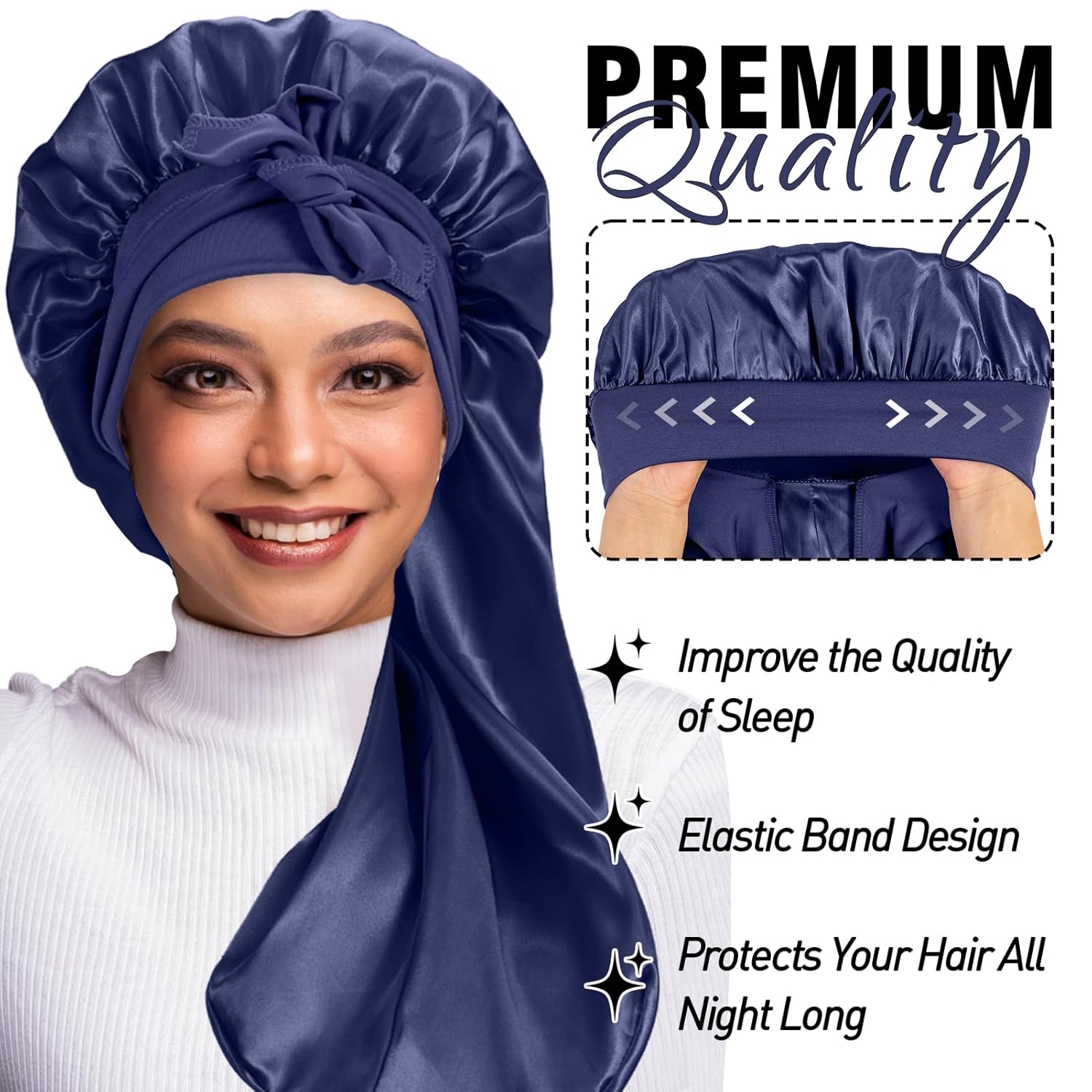 2Pcs Bonnets for Women Sleeping Braid Bonnet, Large Long Satin Silk Bonnet for Braids, Black Women Braid Bonnets with Stretchy Tie Band for Sleeping Extra Long (Brown & Dark Blue) Purple