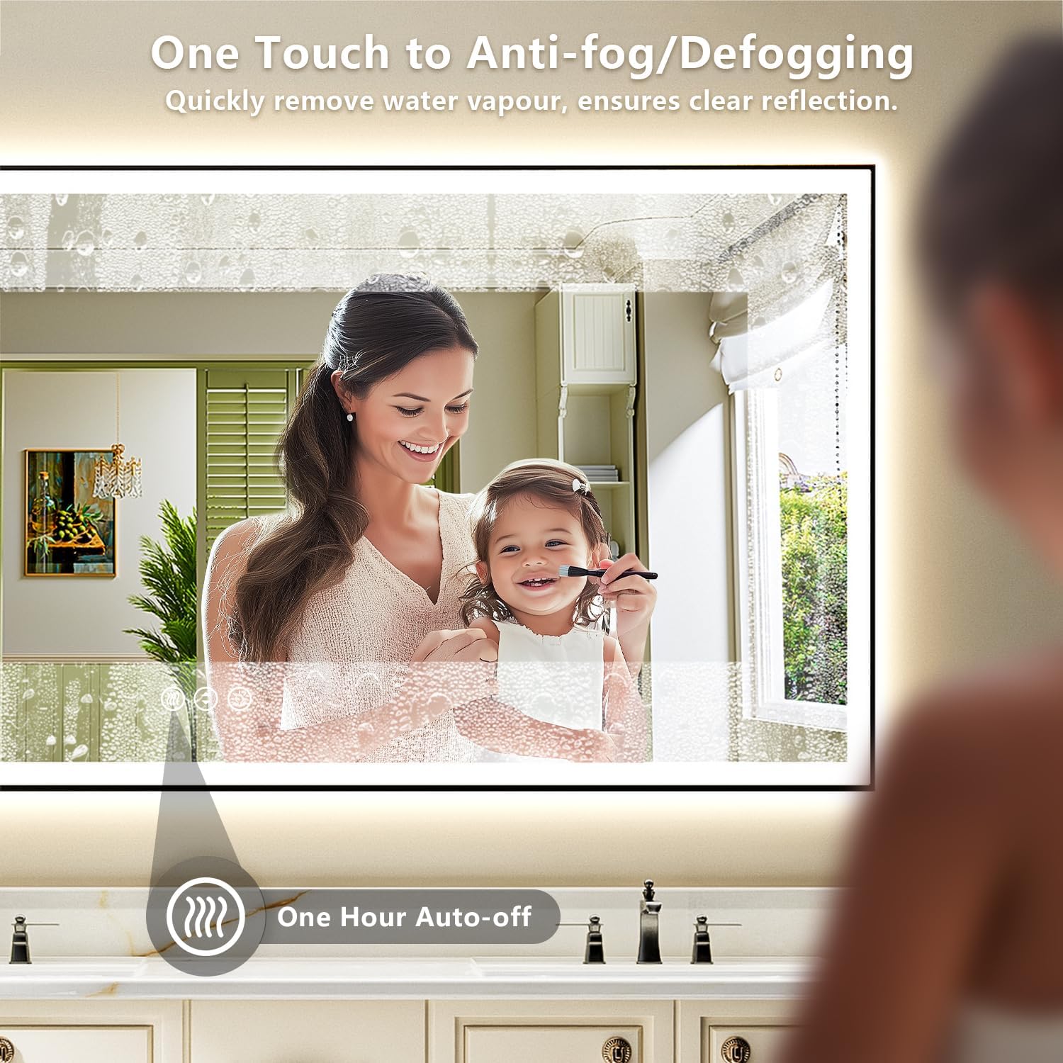 - 🔥【Anti-Fog/Defog, Clear Reflection】- Still troubled by the fog on the mirror after shower? This anti-fog lighted mirror can free you from this trouble. Turn on the defogger can quickly remove water vapor, always maintain a clear reflection. It will auto turn off after an hour. Long press the "Anti-fog" button can turn off the blue light of 3 buttons.