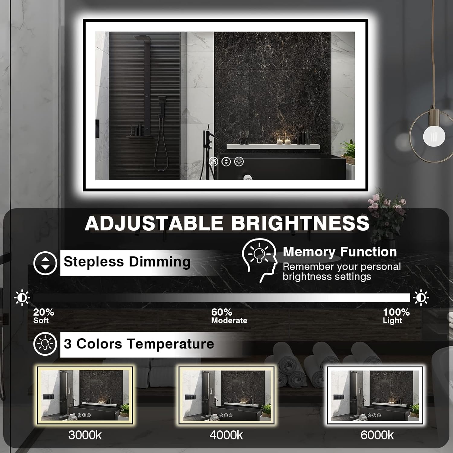 60x36 LED Bathroom Mirror - Black Aluminum Framed (Front and Backlit), Anti-Fog Smart Mirror, Stepless Dimmable, 3 Colors (Horizontal/Vertical)