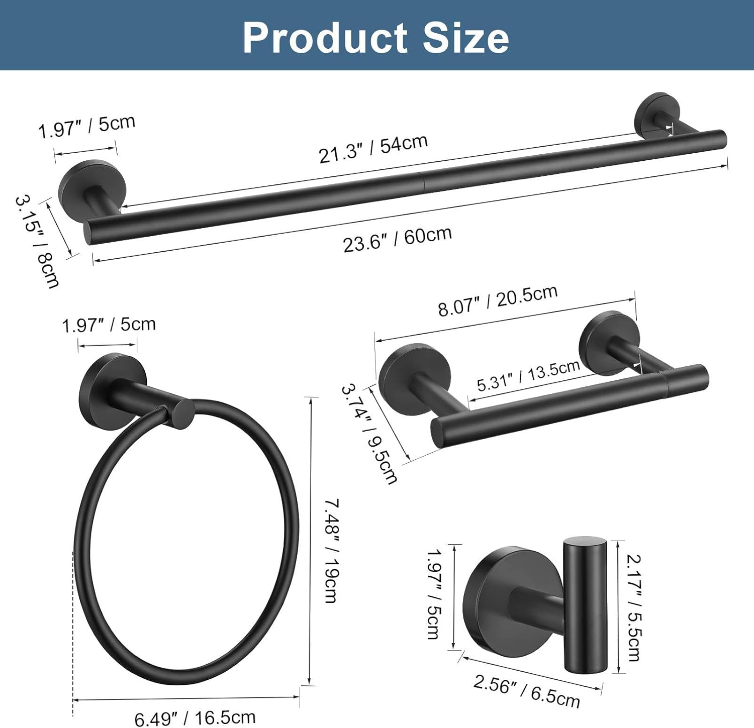 - 【5 Pieces Bathroom Hardware Set】 Bathroom set includes 1 x 23.6inches towel bar, 1 x toilet paper holder, 1 x towel ring, 2 x robe & towel hooks.