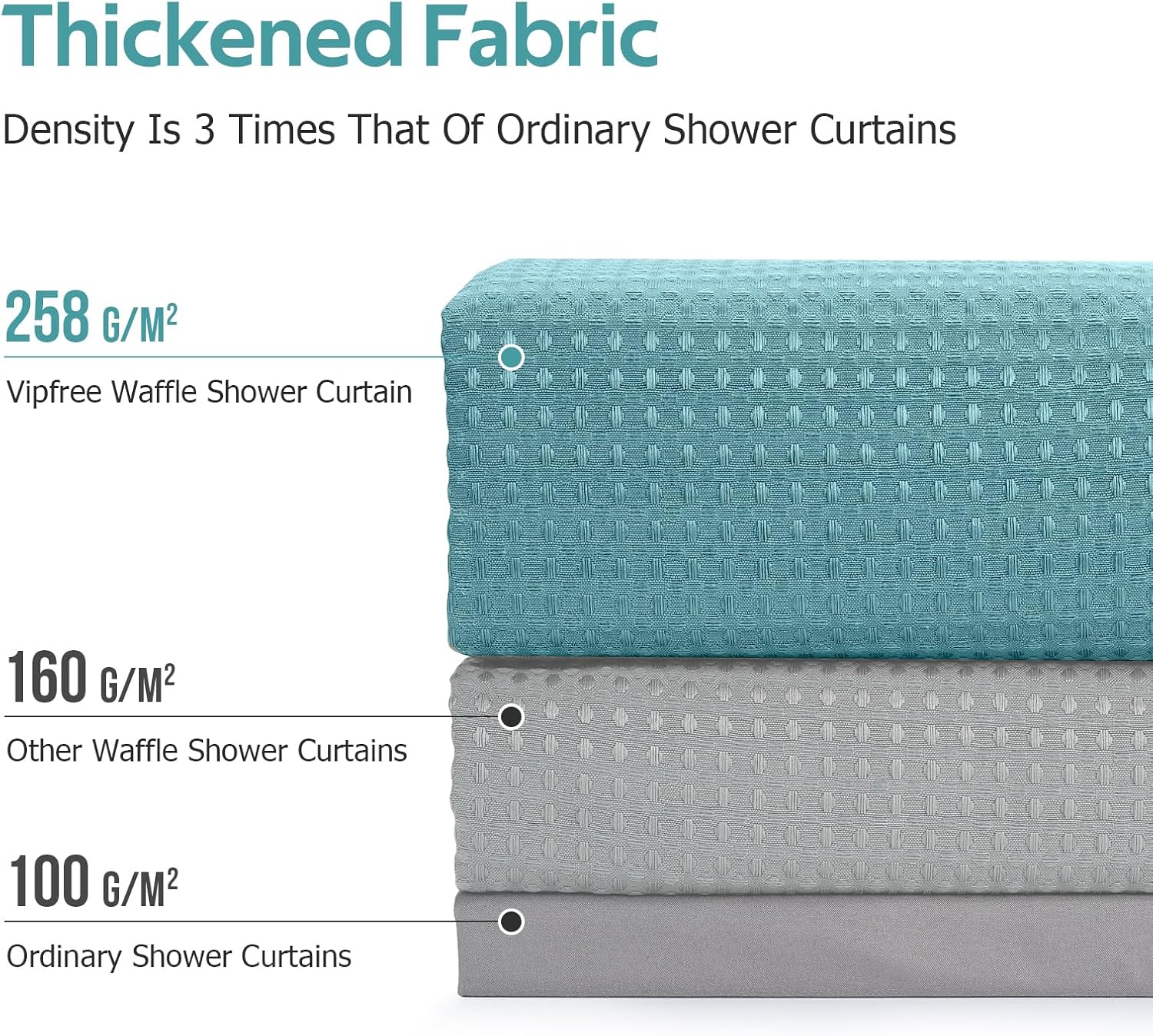 - High-Quality Polyester Fabric & Privacy Protection: Crafted from 258 GSM (grams per square meter) high-quality polyester fabric, it is fabric is thick yet allows good translucency, it is 1.12 pounds heavier than the 90 GSM fabric shower curtain. The added 30g weighted hem prevents the shower curtain from floating, ensuring enhanced privacy protection for you. The waffle weave pattern adds a touch of luxury and elegance to your bathroom