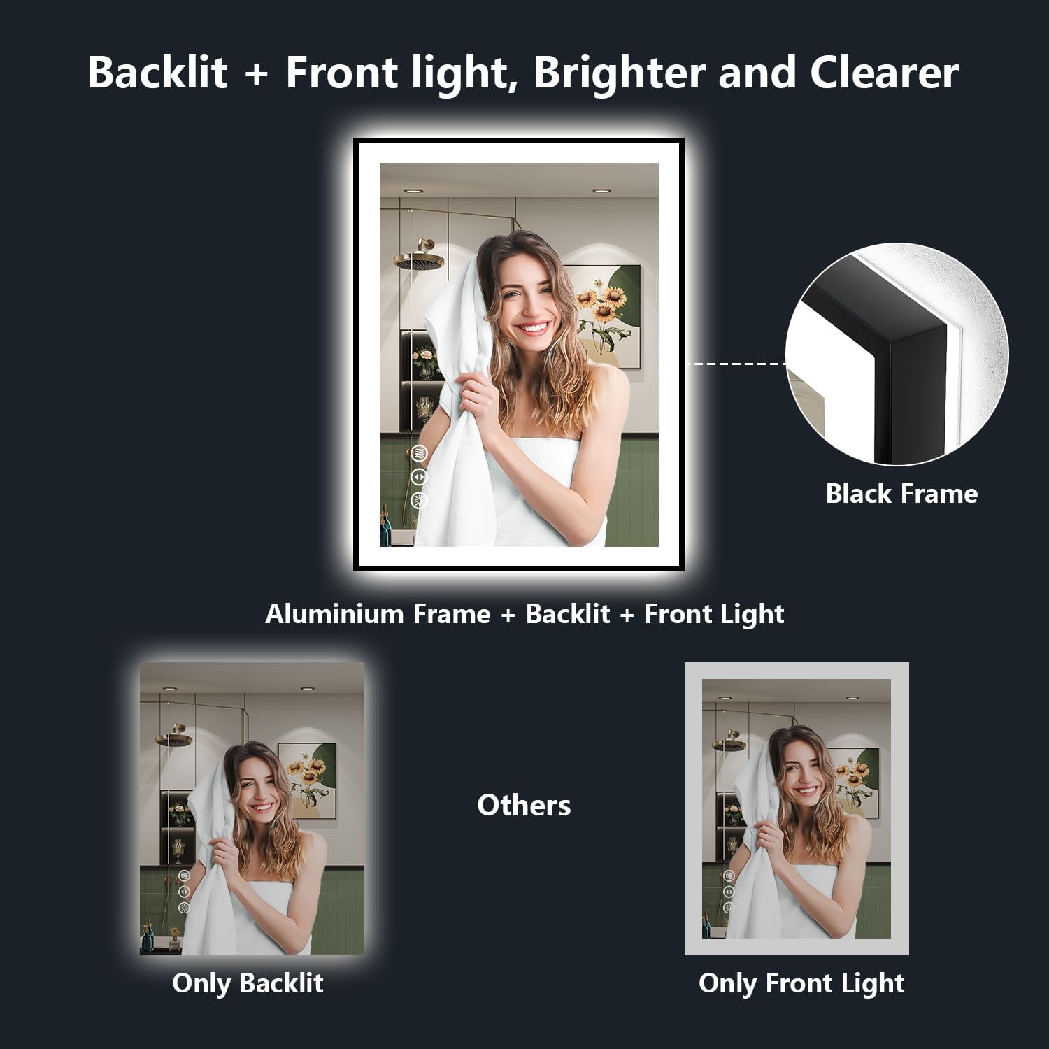 - 🔆【Backlit+Front Lit & Black Frame】- Designed with double lighting, our Led mirror for bathroom is twice or more brighter than ordinary lighted bathroom mirror. Bright enough for makeup, shaving or beauty care. The modern look of black frame is perfect for you to remodel and upgrade bathroom.