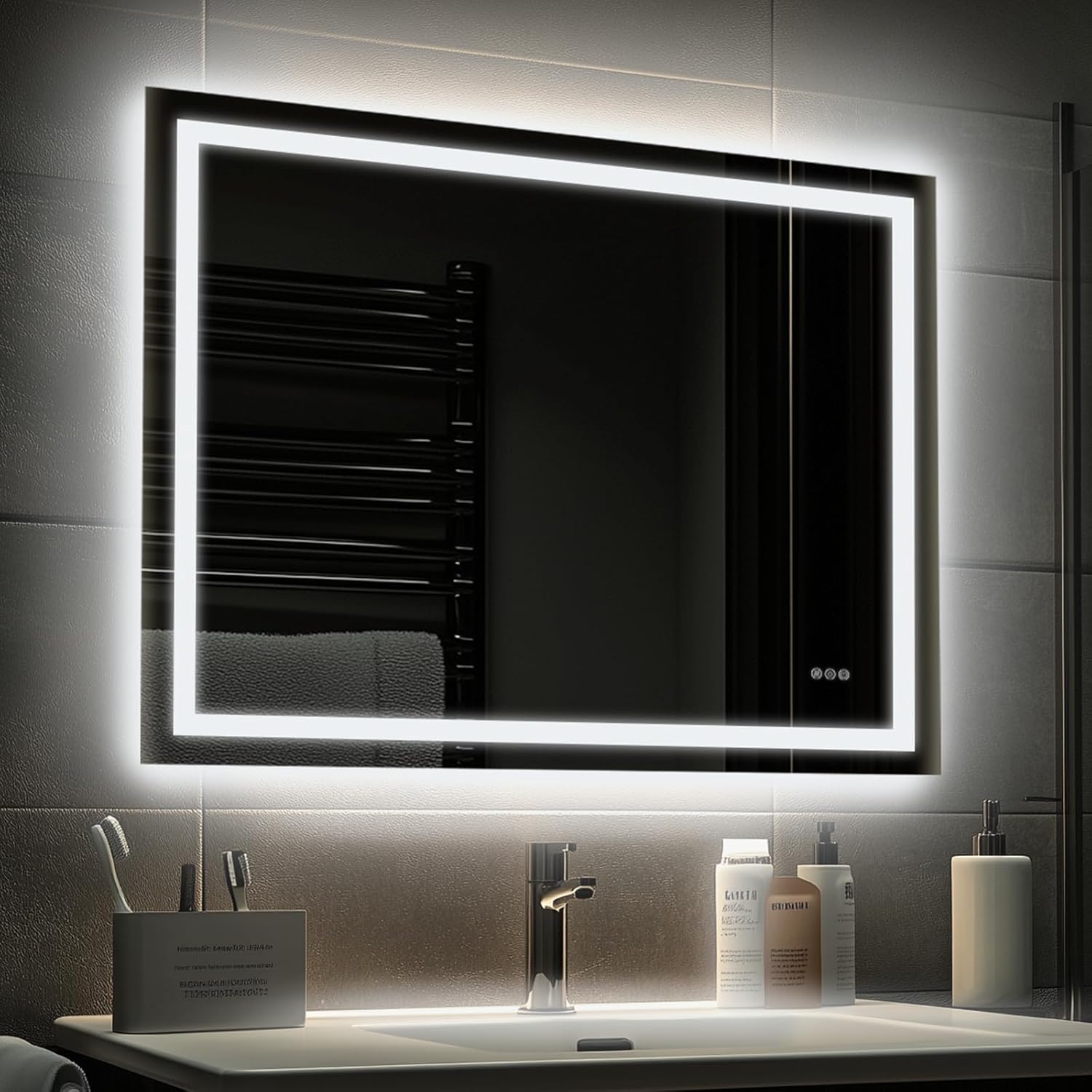- ULTIMATE CLARITY - Our silver-coated mirror offers crystal-clear reflection with true-to-life colors. Anti-oxidation technology prevents black spots and edges for up to 10 years. Tempered glass ensures flawless flatness for distortion-free image. Use the defog function before shower to keep the mirror mist-free. We've integrated innovative touch on/off control into the mirror's surface, eliminating physical switch for convenience. Experience the real you w/our advanced vanity mirror technology.