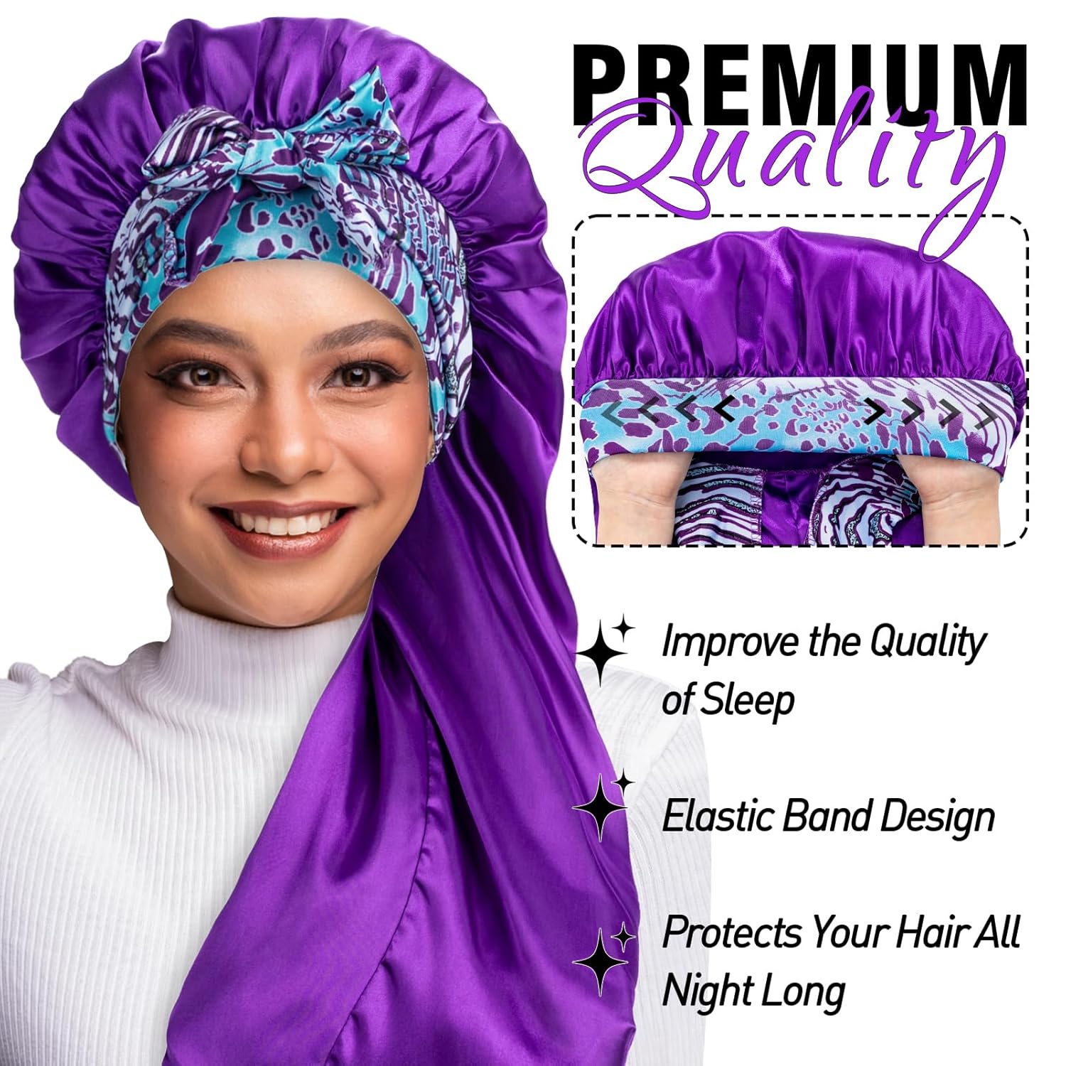 2Pcs Bonnets for Women Sleeping Braid Bonnet, Large Long Satin Silk Bonnet for Braids, Black Women Braid Bonnets with Stretchy Tie Band for Sleeping Extra Long (Black & Purple Pattern)