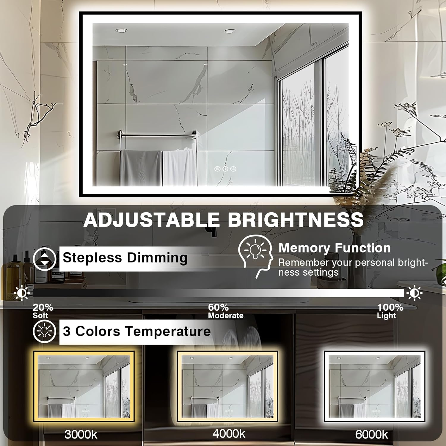 55x40 Bathroom Mirror with LED Lights - Black Framed, Front and Backlit Mirror, Anti-Fog LED Vanity Mirror, 3 Colors and Dimmable Mirror, Waterproof, Corrosion Proof (Horizontal/Vertical)