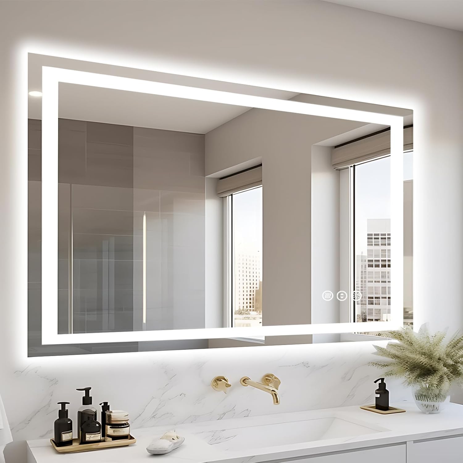 - [Anti-Fog & Water-Proof] Say goodbye to foggy mirrors! Our LED bathroom mirror includes a built-in defogger, ensuring your reflection stays clear even after steamy showers. Plus, the defogger and light strip are waterproof, providing you with safe lighting in wet conditions.