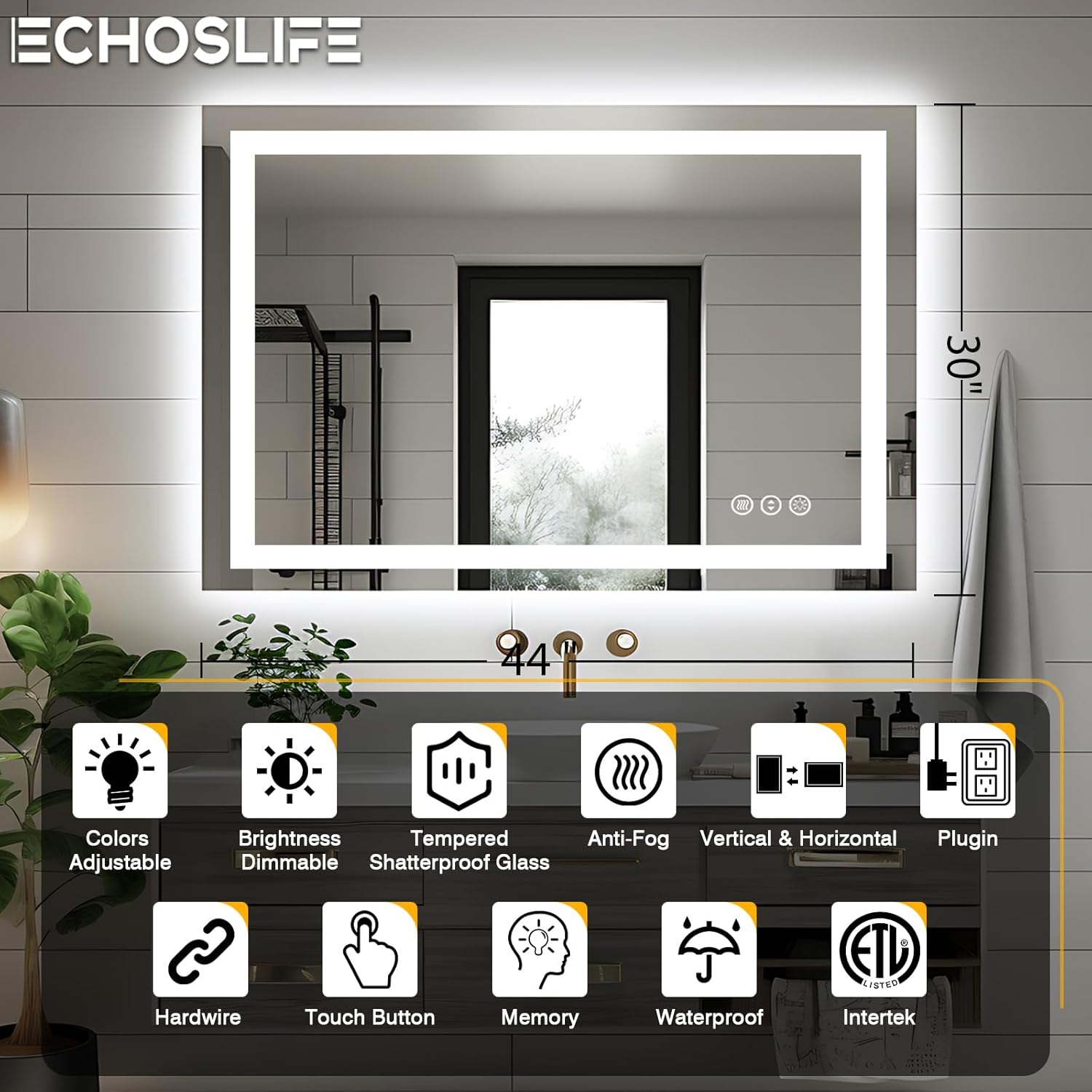 - [Easy Installation] EchosLife bathroom mirror can be powered on using a hard wire or plug-in, making it convenient to use. You have the flexibility to mount this LED mirror either horizontally or vertically according to your personal preference to match your home style.