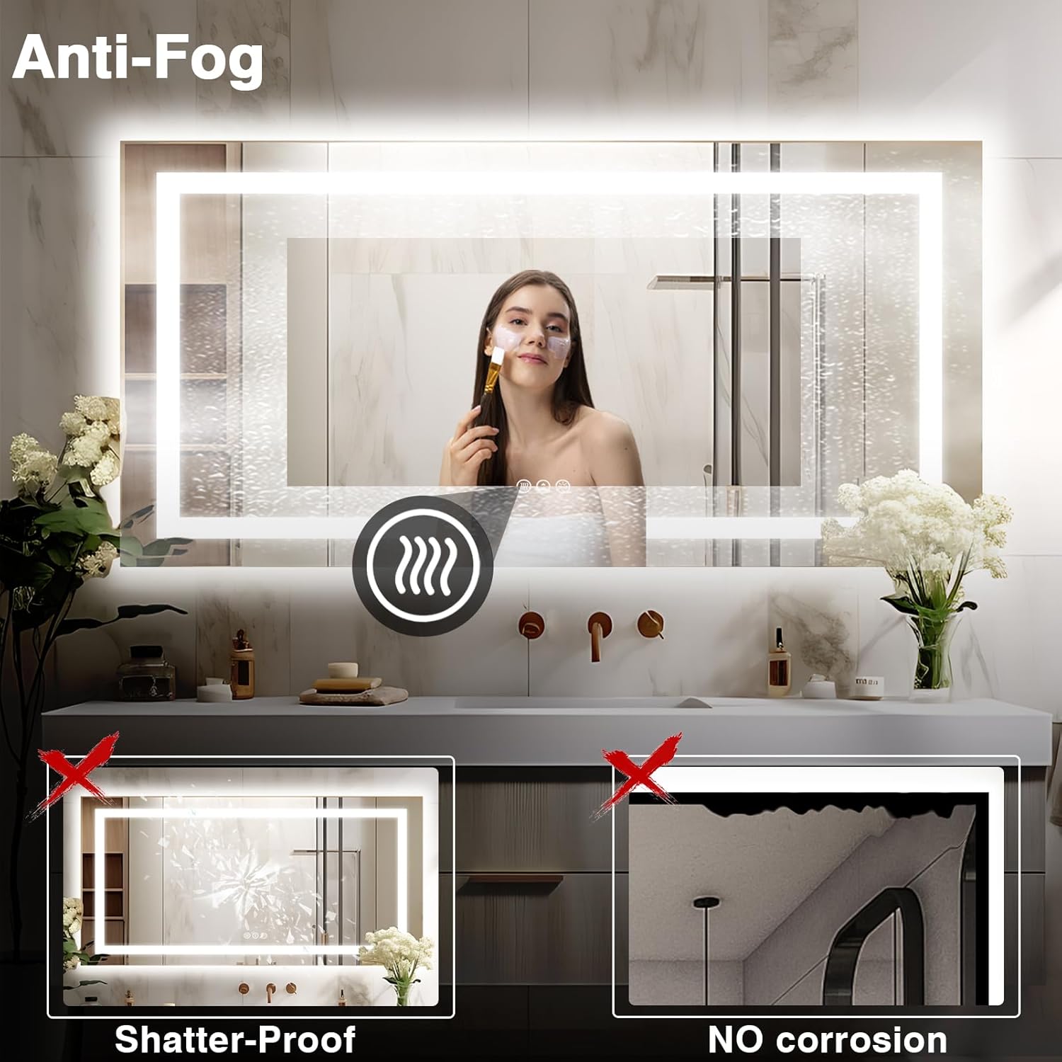 - [Anti-Fog & Water-Proof] Say goodbye to foggy mirrors! Our LED bathroom mirror includes a built-in defogger, ensuring your reflection stays clear even after steamy showers. Plus, the defogger and light strip are waterproof, providing you with safe lighting in wet conditions.