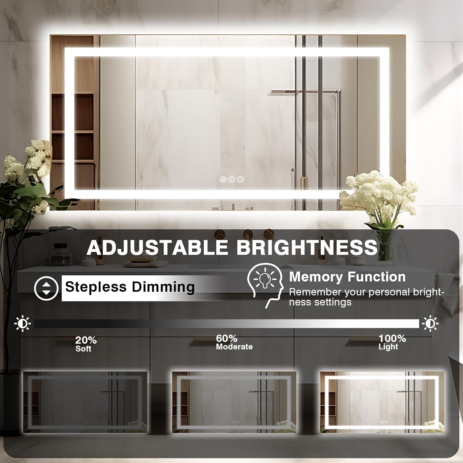 72"x40" Large LED Bathroom Mirror with Lights (Front & Backlit), Fogless, Stepless Dimmable, 3 Color Smart Mirror (Horizontal/Vertical)