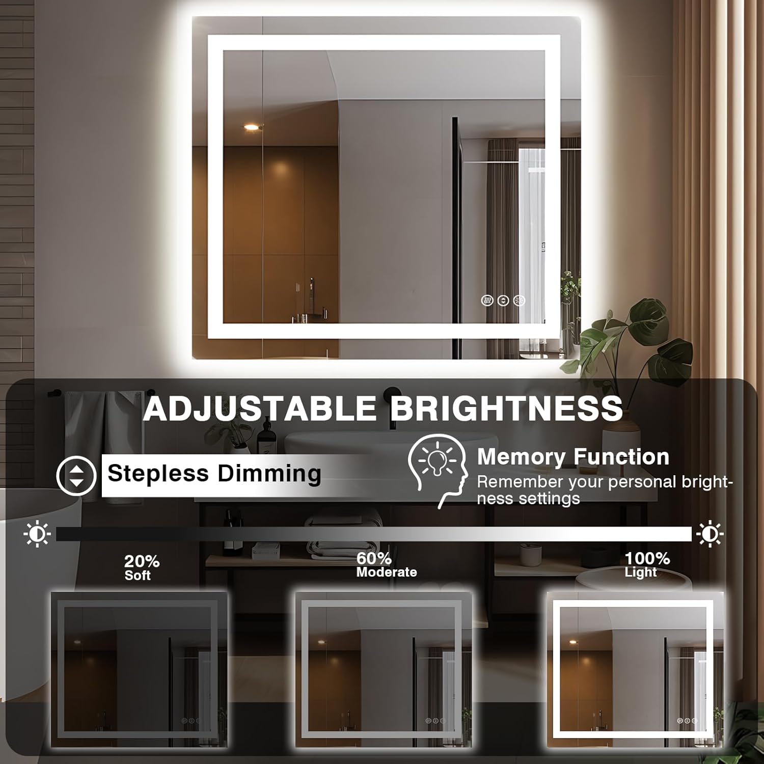 40"x38" Lighted Mirrors for Bathroom Wall, Front and Backlit, Anti-Fog LED Vanity Mirror, Shatter-Proof, 3 Colors Memory Mirror (Horizontal/Vertical)
