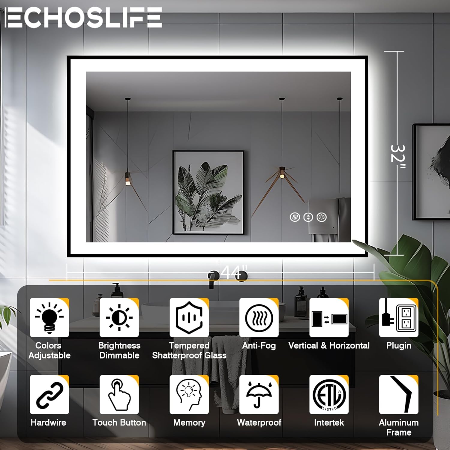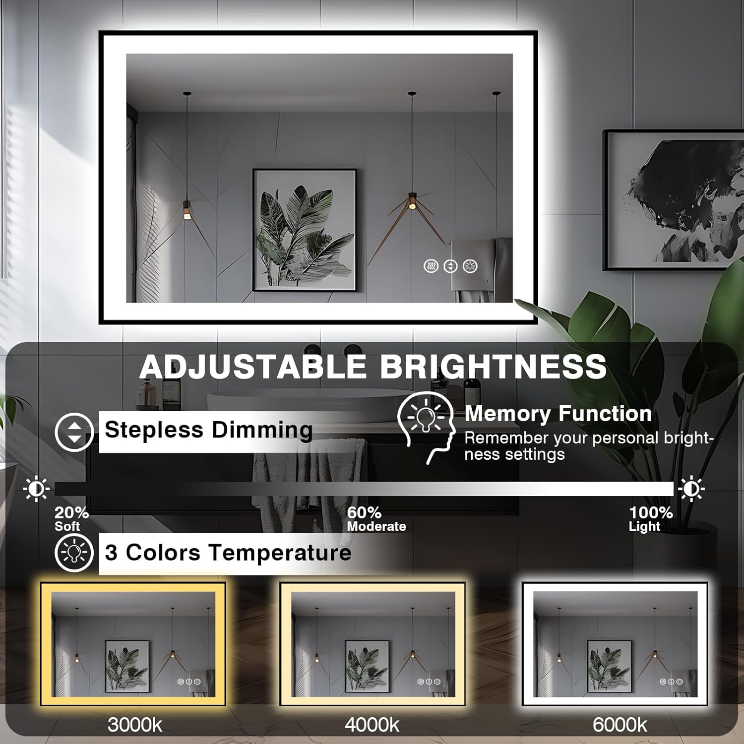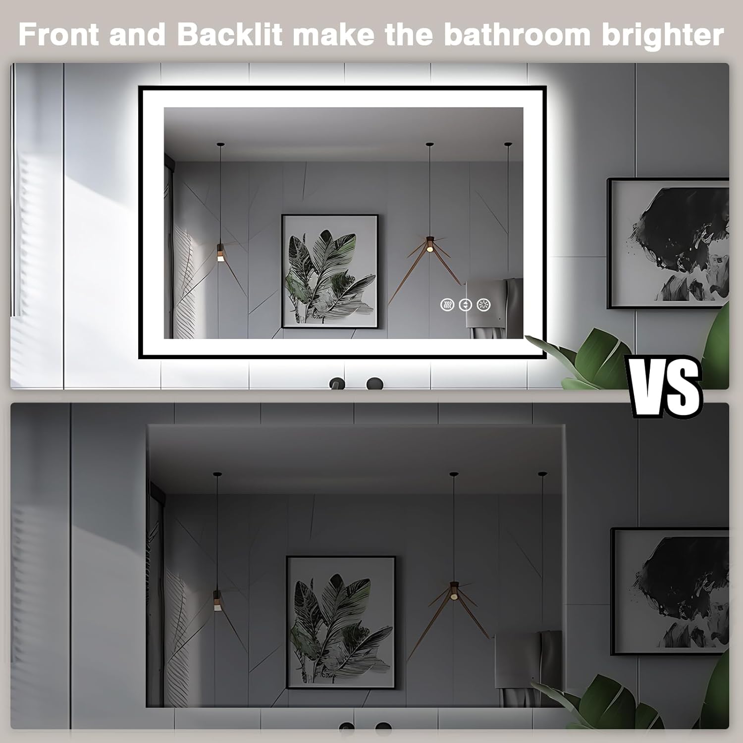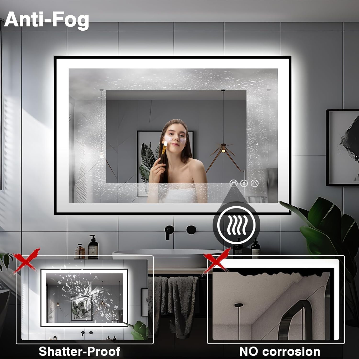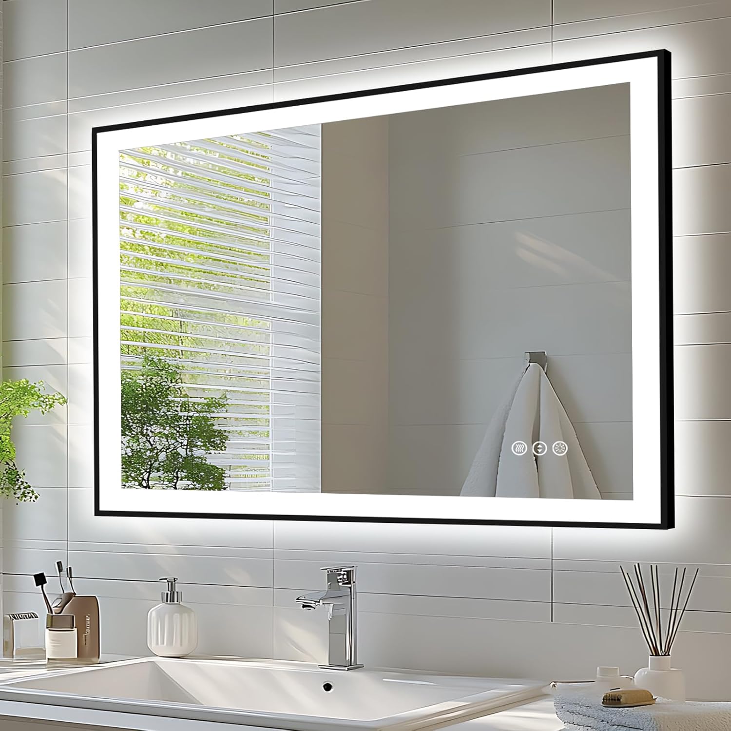 44x32 Bathroom Mirror with LED Lights - Black Framed, Front and Backlit Mirror, Anti-Fog LED Vanity Mirror, 3 Colors and Dimmable Mirror, Waterproof, Corrosion Proof (Horizontal/Vertical)
