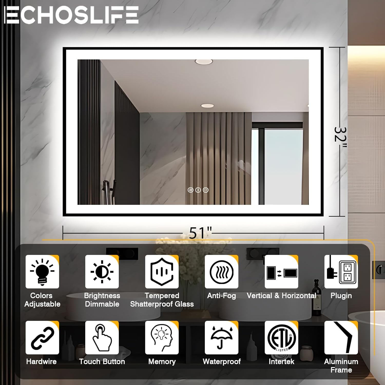 - [Ease of Assembly] EchosLife's lighted bathroom mirror features excellent mounting systems with typical "ledge" design that will never dislodge, making installation a breeze.