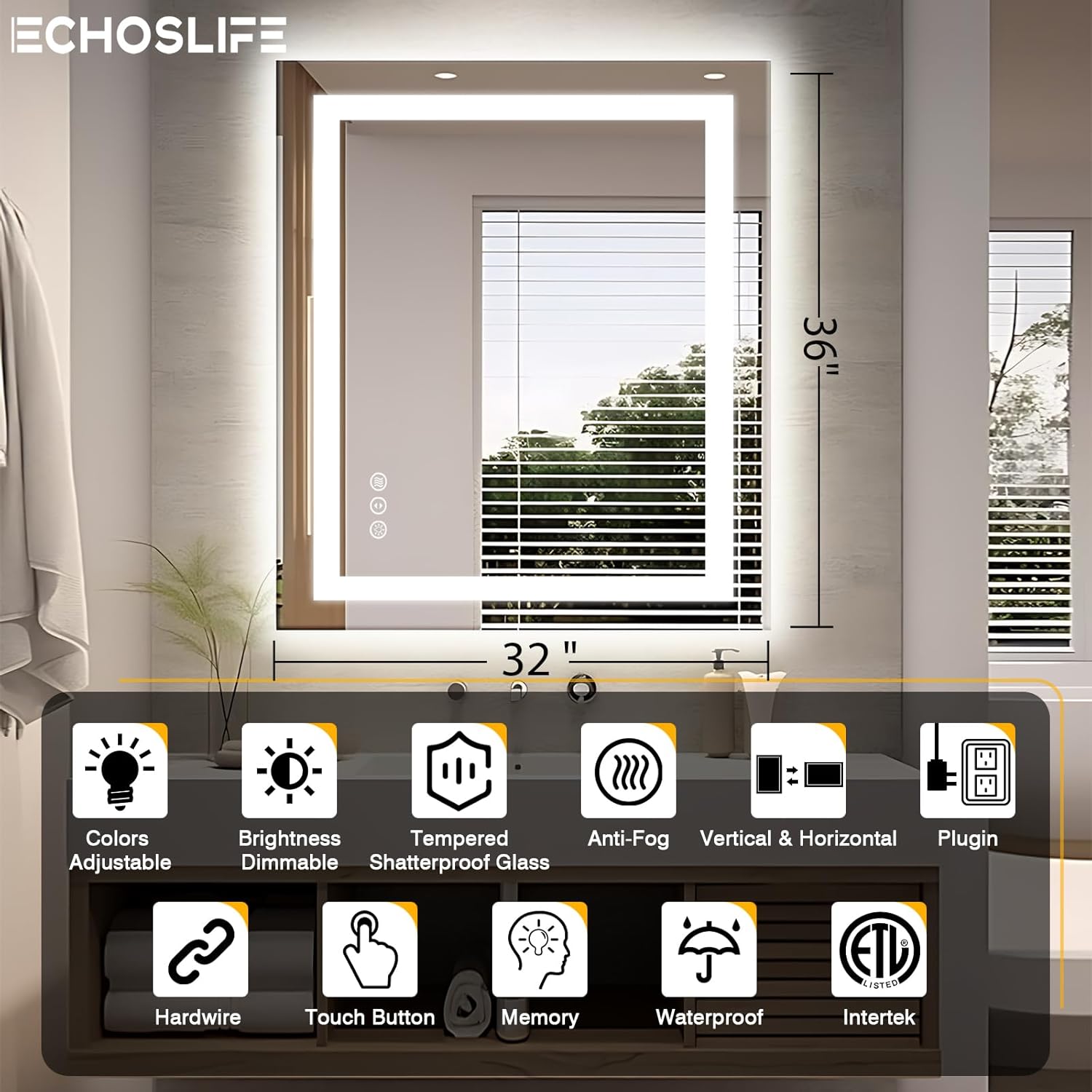 - [Easy Installation] EchosLife bathroom mirror can be powered on using a hard wire or plug-in, making it convenient to use. You have the flexibility to mount this LED mirror either horizontally or vertically according to your personal preference to match your home style.