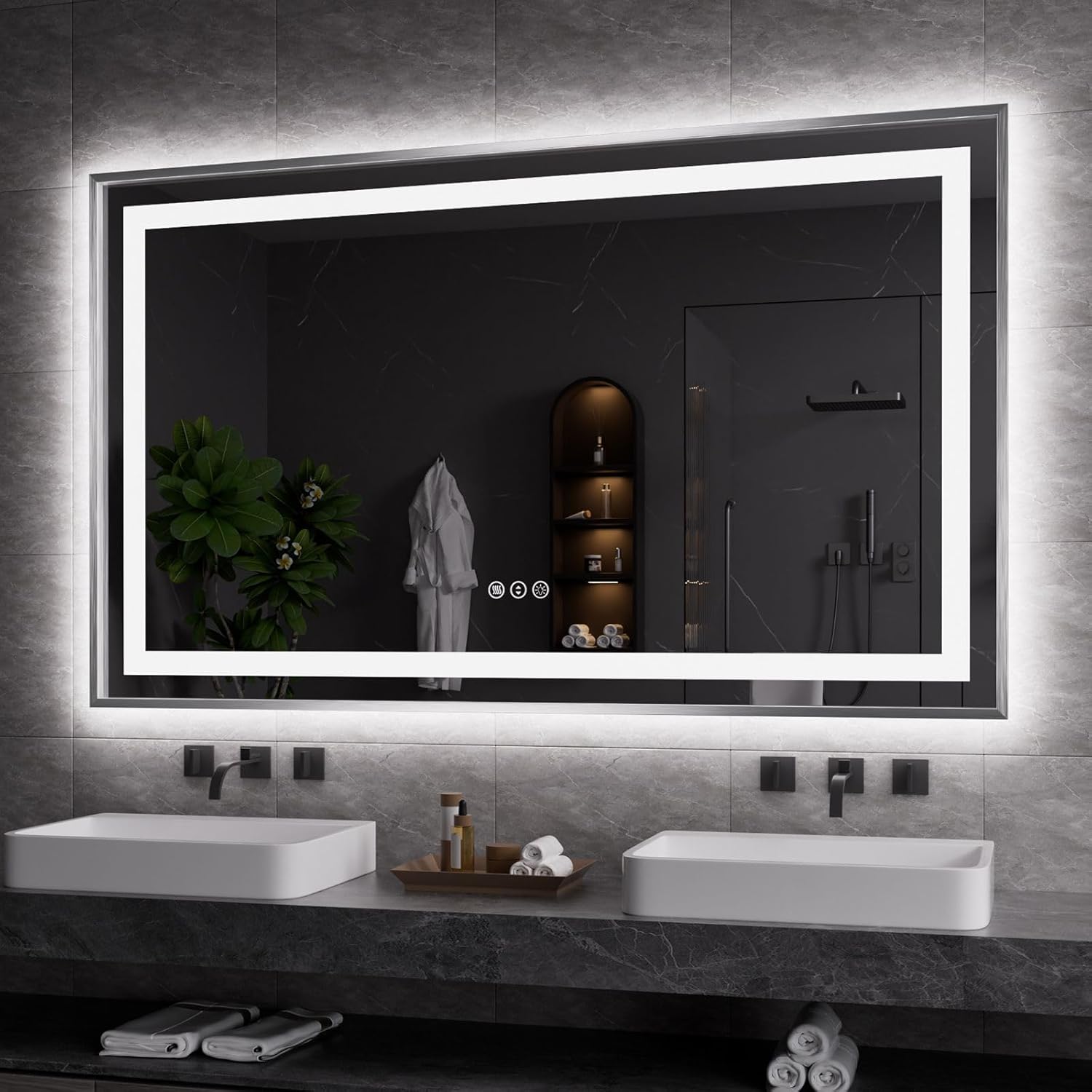Amorho 60"X36" LED Bathroom Mirror, Brushed Nickel Framed Mirror with Front Light and Backlit, Stepless Dimmable, Anti-Fog, Shatter-Proof, Memory, 3 Colors
