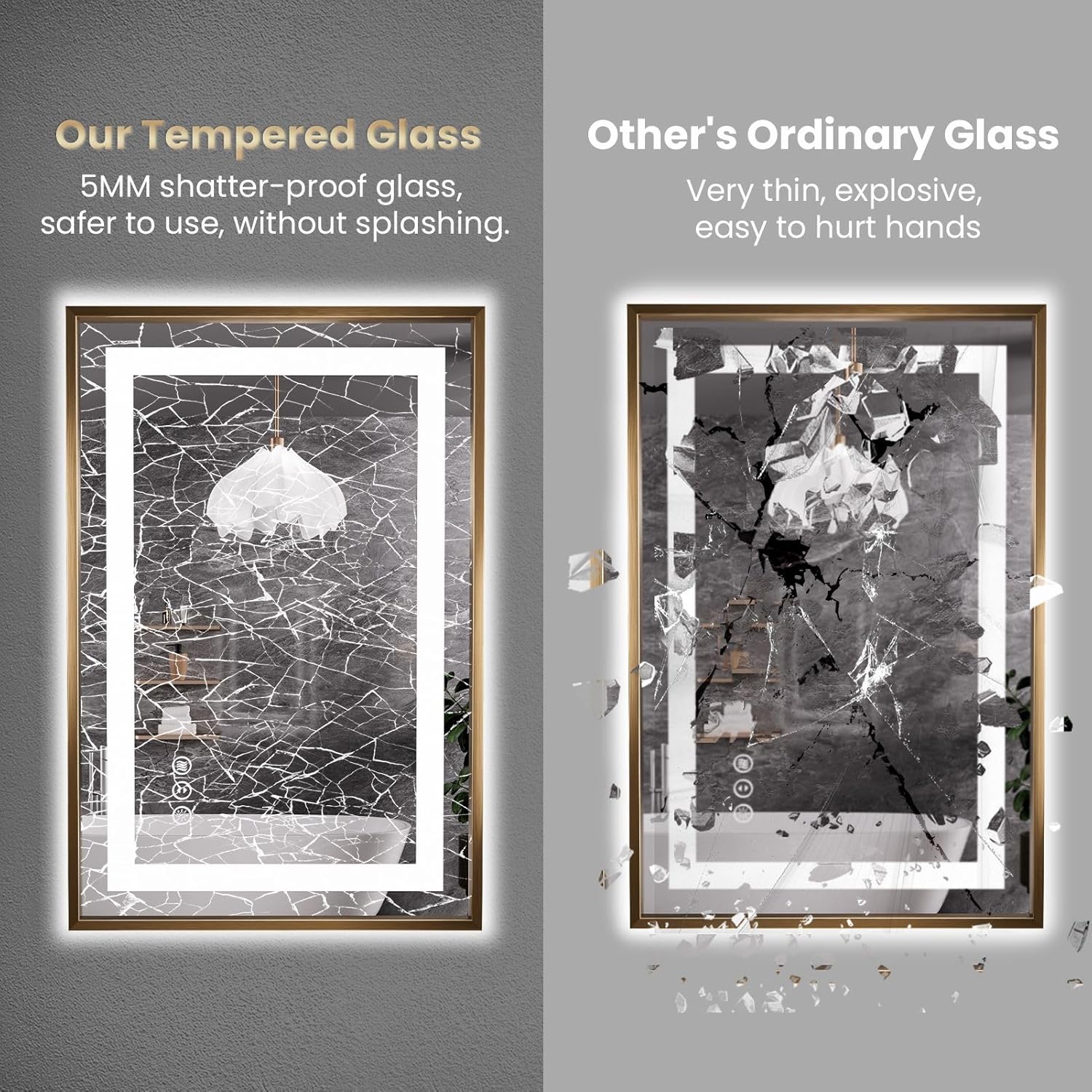 - [Shatterproof & Safe to Use]: Our mirrors are made of durable tempered glass, will not get broken easily, and even it's broken, it will not shatter to sharp pieces, no harm; With the epoxy coat, our mirror can corrosion proof for longlife