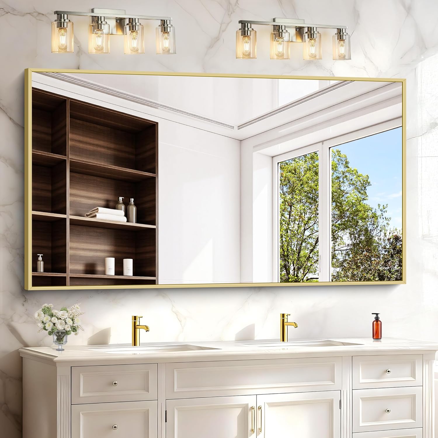 - SAFE USE: Brushed Gold bathroom Mirror safety backing strengthens the glass surface, making it less prone to breakage and falling off, you can use it with confidence, the mirror design is simple, and the universal size can adorn your room well.