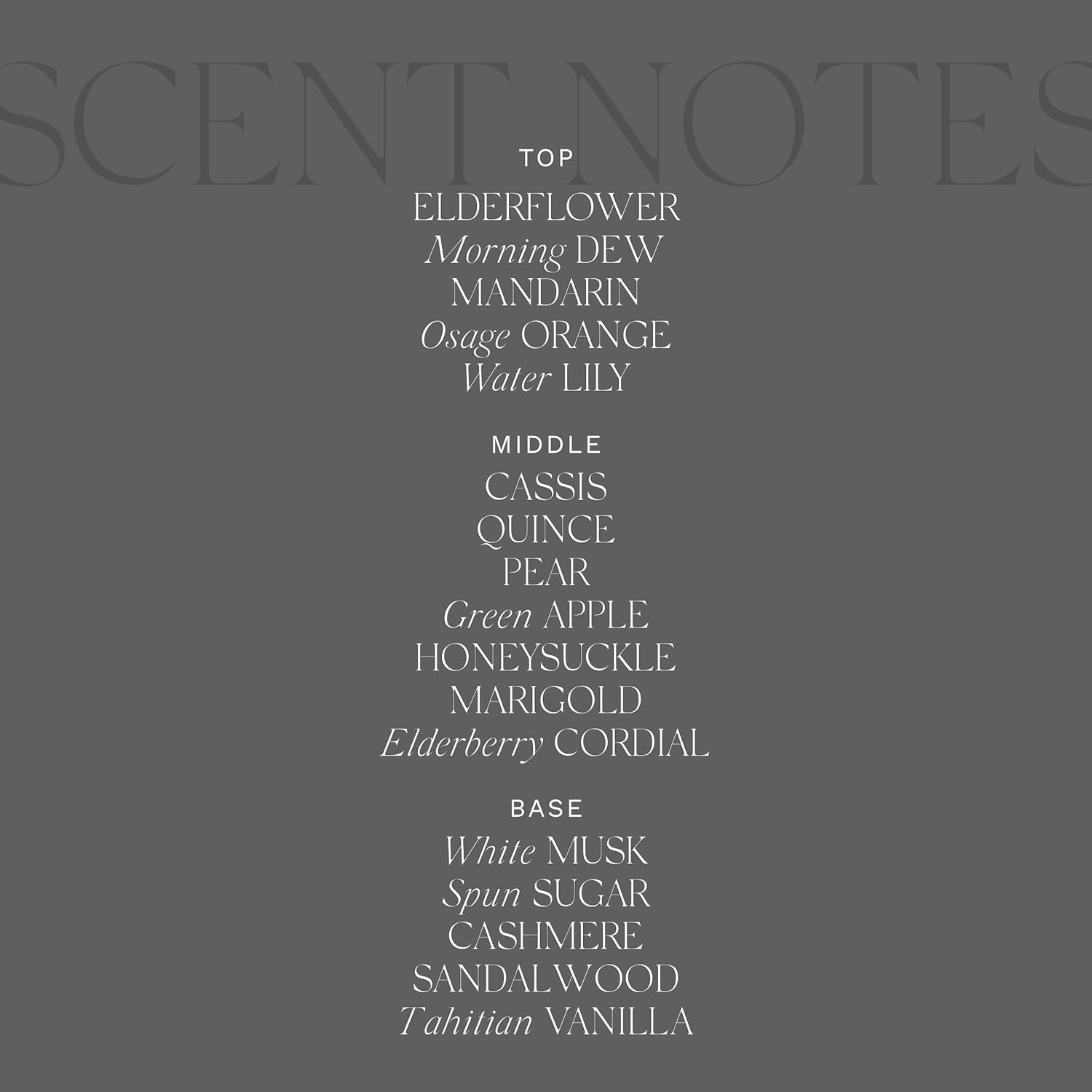 - Ethereal Spring: Glistening elderflower is enhanced by notes of pear, quince and osage orange, freshly picked off the branch; a translucent base of spun sugar and cashmere lends a lingering elegance