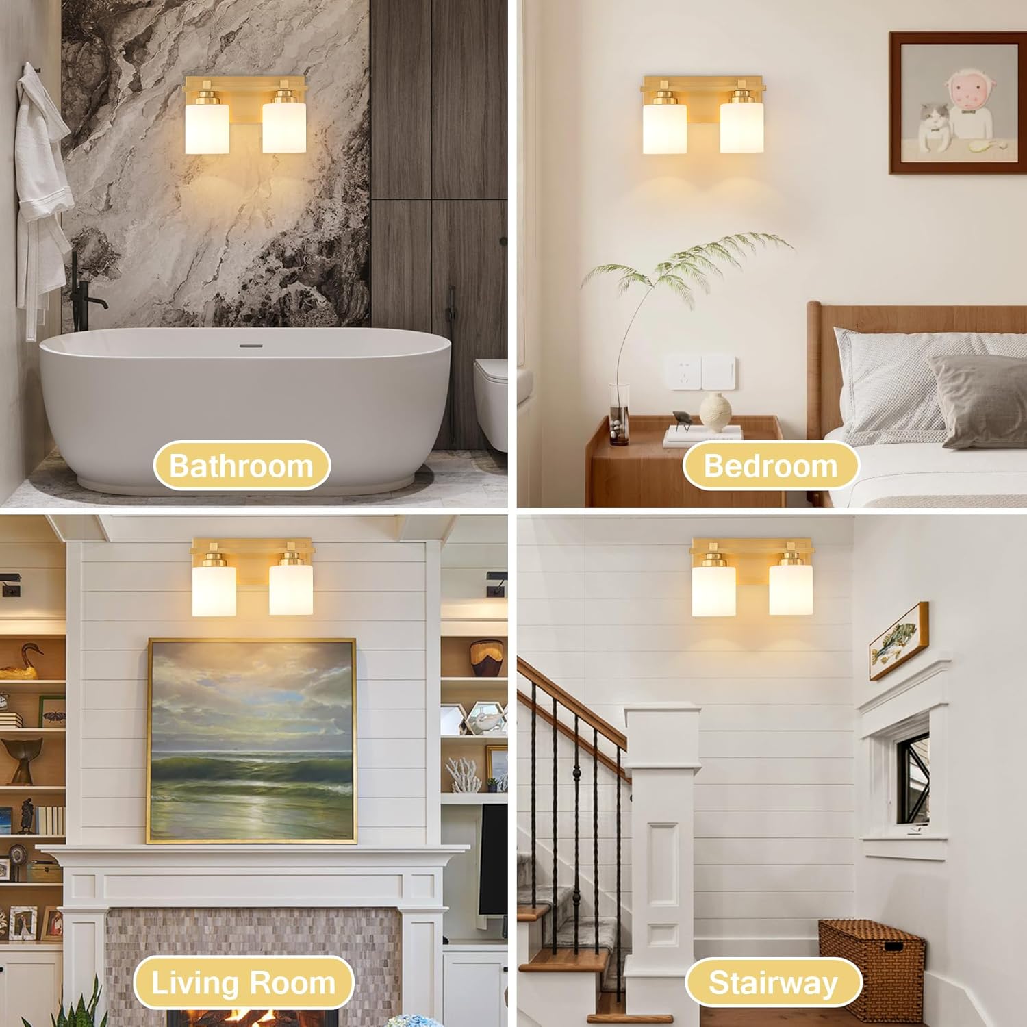 - 【Upgrade Unique Design】 The high quality metal base of brass finish bathroom vanity light, exudes a simple and pure beauty, reflecting a high quality texture. Combined with the milky white glass shade hue, it shows a sophisticated modern style. They are also resistant to rust and corrosion, ensuring their longevity and reliability. Say goodbye to frequent replacements and enjoy the beauty of bathroom lighting fixtures for years to come.