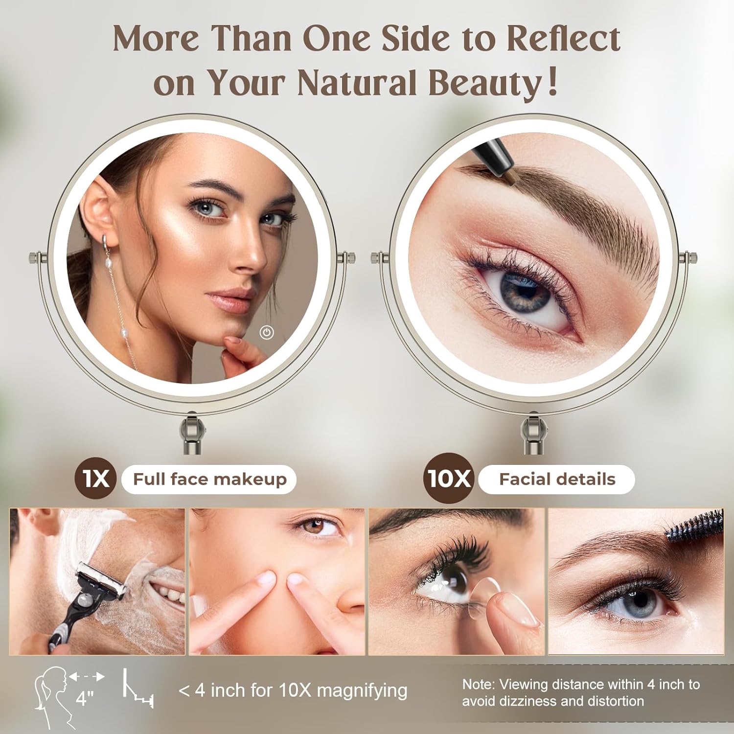 - 【Dimmable & 3 Color Lighting】This magnifying mirror with light offers white lights, warm lights, and natural lights. Simply change different light effects to satisfy your different makeup needs or test your makeup effects in different light situations by clicking the switch on mirror: white light satisfies your daily makeup need and office light situation; warm light for party or club makeup; and natural light for date or outdoor makeup.