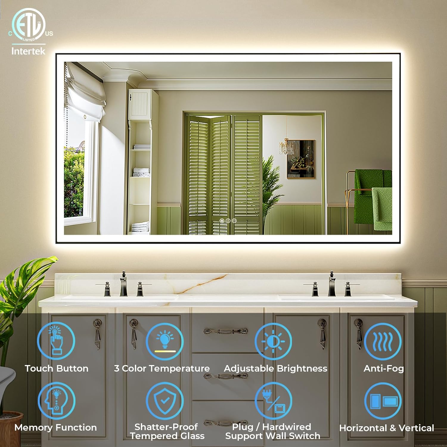 - 🔆【Backlit+Front Lit & Black Frame】- Designed with double lighting, our Led mirror for bathroom is twice or more brighter than ordinary lighted bathroom mirror. Bright enough for makeup, shaving or beauty care. The modern look of black frame is perfect for you to remodel and upgrade bathroom.