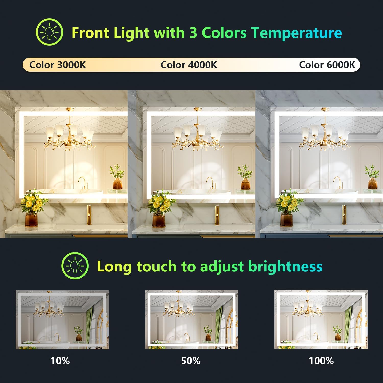 - 💎【3+8 Light Colors, Make a Difference】- This led mirror for bathroom has 3 front light modes: warm(3000K), white (4000K) and cold (6000K). RGB backlit has 8 light modes: warm / white / cold / flowing colorful / purple / red / green / blue. THE BACK LIGHT CAN BE WHITE ONLY! The muli color tone options are what makes this led vanity mirror and what makes your bathroom truly difference.