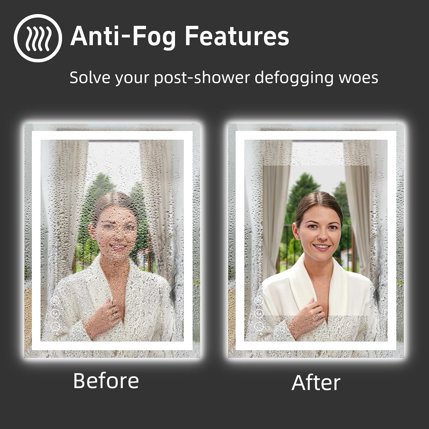 - 【Anti-fog & Memory Function】: Tired of coming out of the shower to fogged-up bathroom mirrors that you have to wipe with your towel? Our smart mirror bathroom equips with a built-in defogger, ensuring a crystal-clear reflection even after hot showers. Anti fog starts quick and one hour auto-off; Memory function helps remember your last setting; No need to reset each time.