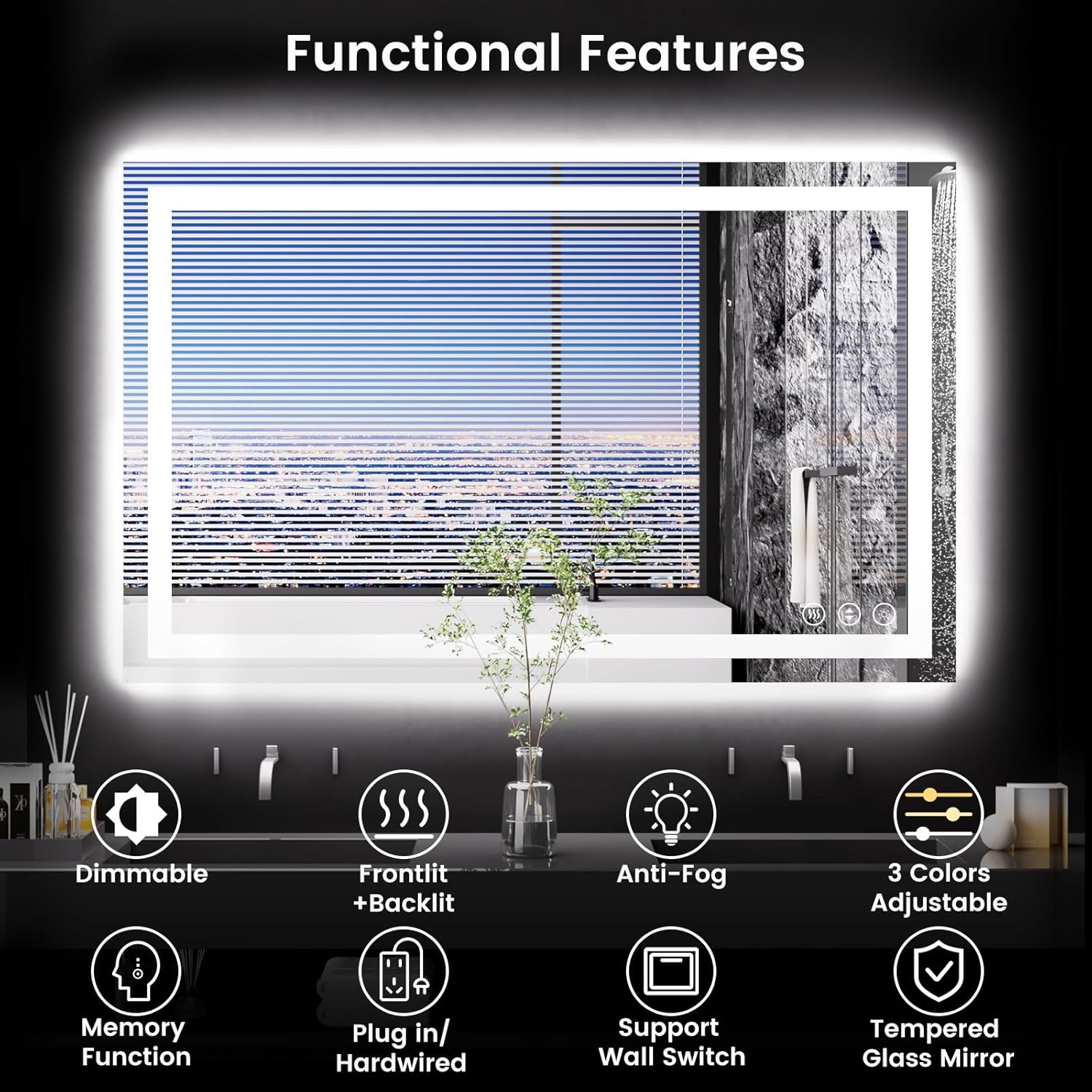 48X30 LED Bathroom Mirror with Lights, Anti-Fog, Backlit + Front Lit, Lighted Bathroom Vanity Mirror for Wall, Memory Function, Dimmable, Tempered Glass, Shatter-Proof, ETL Listed