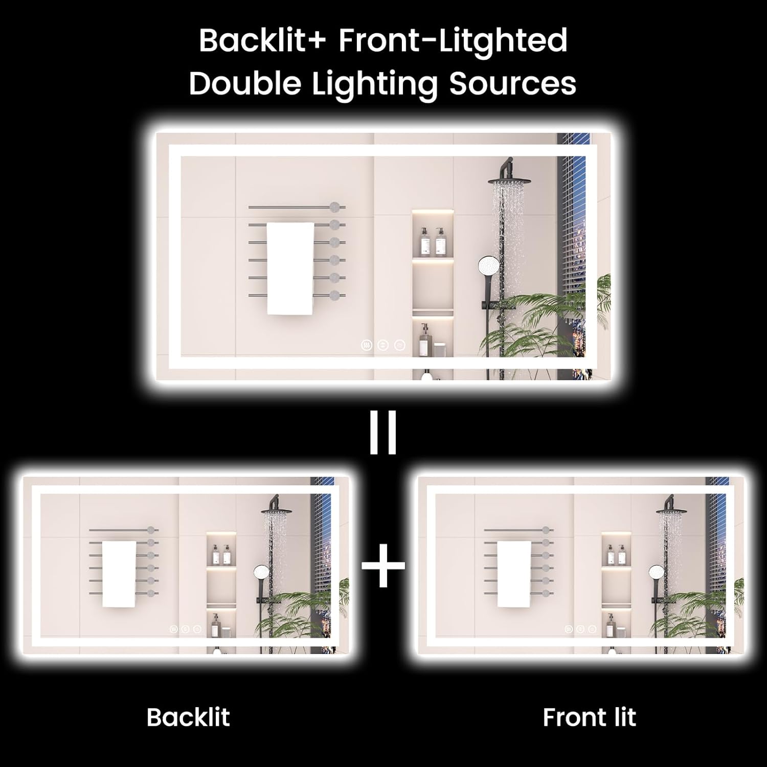 60X40 LED Bathroom Mirror with Lights, Anti-Fog, Backlit + Front Lit, Lighted Bathroom Vanity Mirror for Wall, Memory Function, Dimmable, Tempered Glass, Shatter-Proof, ETL Listed
