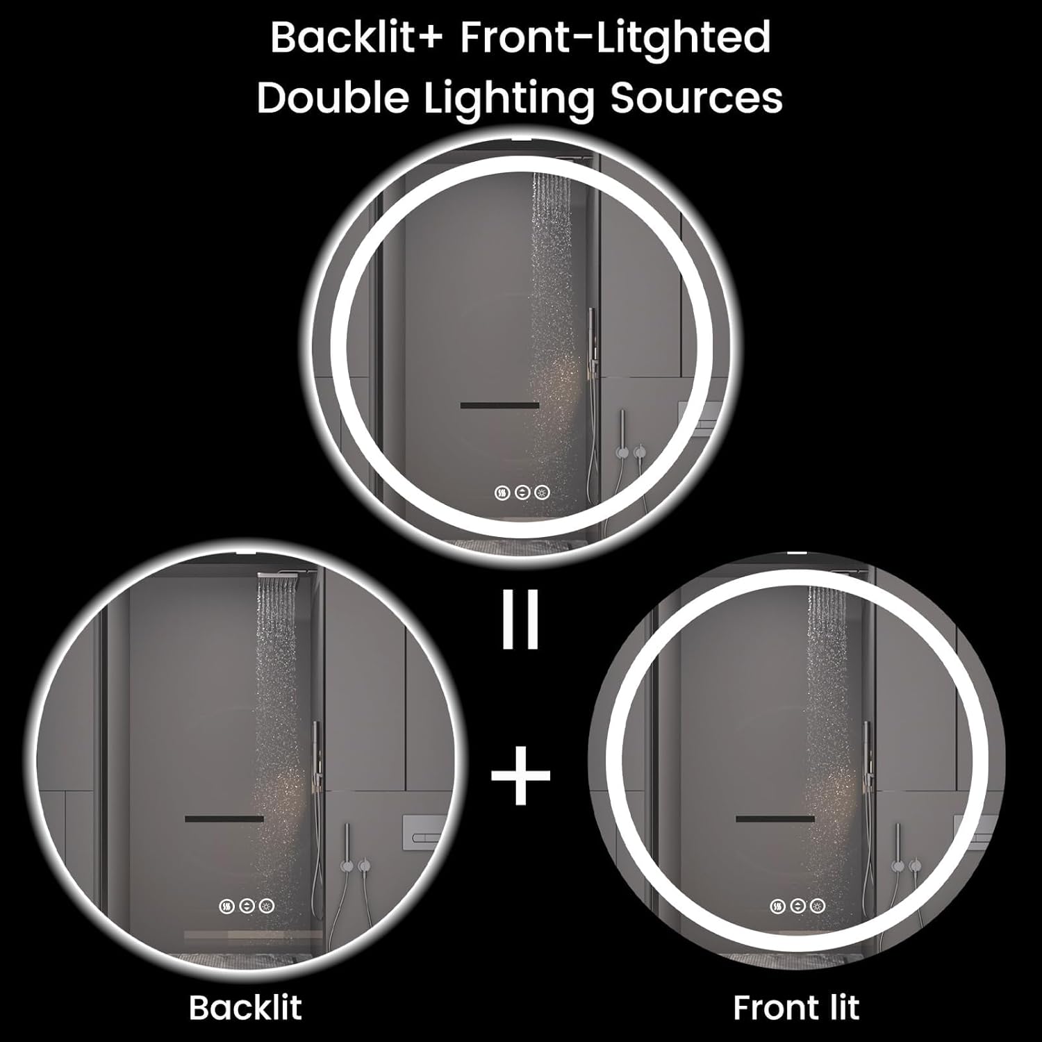 - 【Front and Backlit】This 42" round LED mirror features both front and back lighting, providing an evenly lit surface that enhances your grooming routine. Whether you're applying makeup, shaving, or doing skincare, the bright LED strips ensure flawless visibility. Transform your bathroom into a luxurious beauty station with this stylish wall-mounted vanity mirror.