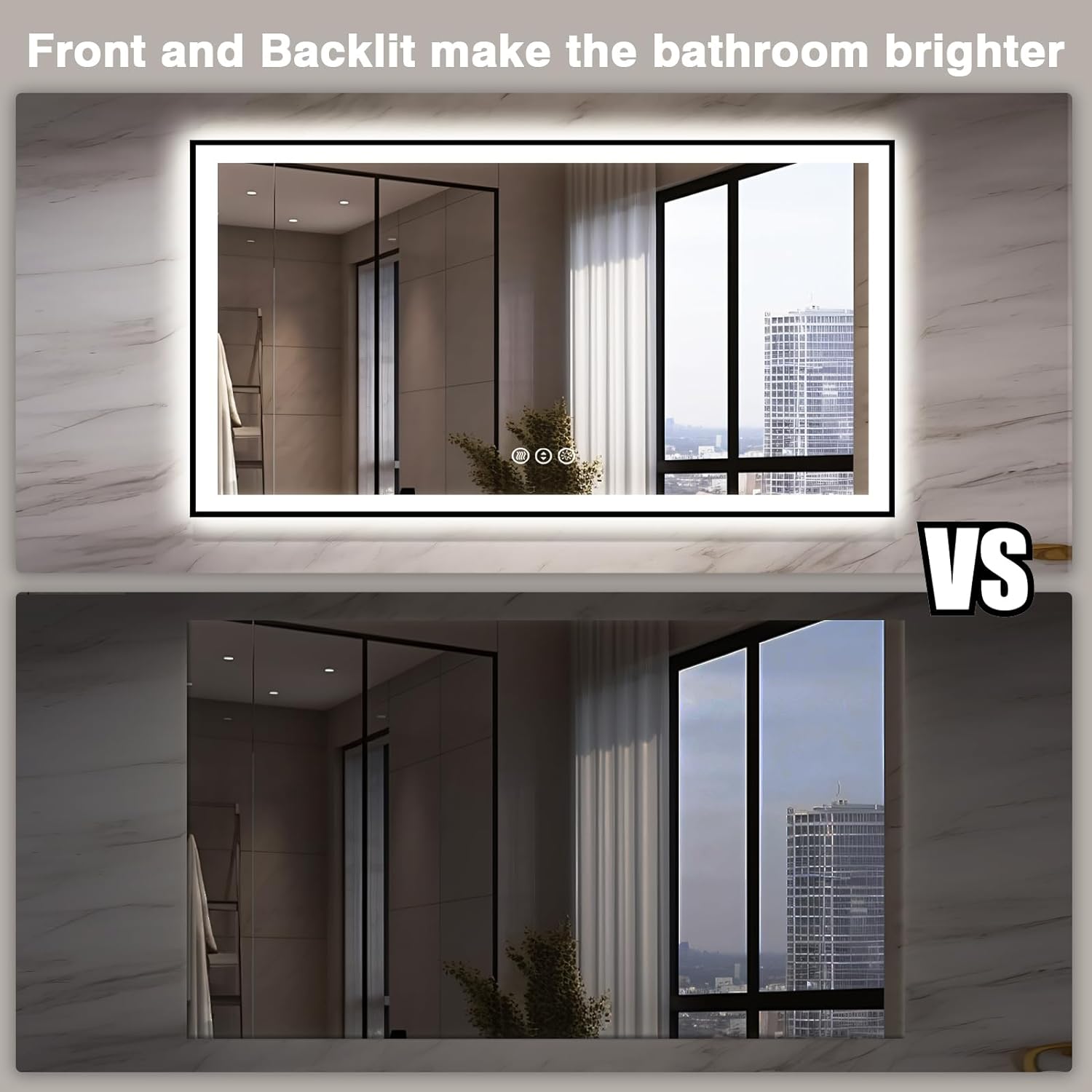 55x30 LED Bathroom Mirrors for Wall -Black Aluminum Framed (Front and Backlit), Anti-Fog Vanity Mirror With Lights,Stepless Dimmable Lighted Mirror,3 Colors Smart Mirror(Horizontal/Vertical)