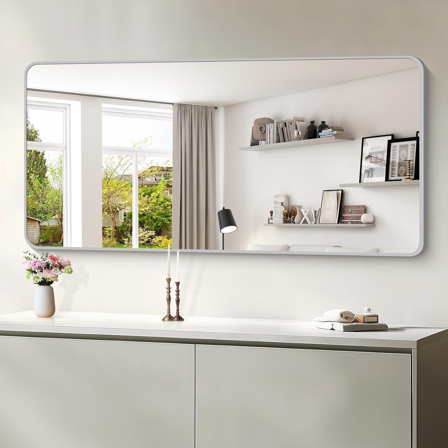 30x60 Inch Silver Bathroom Mirror, Large Rectangular Vanity Mirror, Metal Framed Rectangle Mirror, Rounded Corner Wall Mounted Mirrors for Living Room Bedroom Entryway Horizontal or Vertical