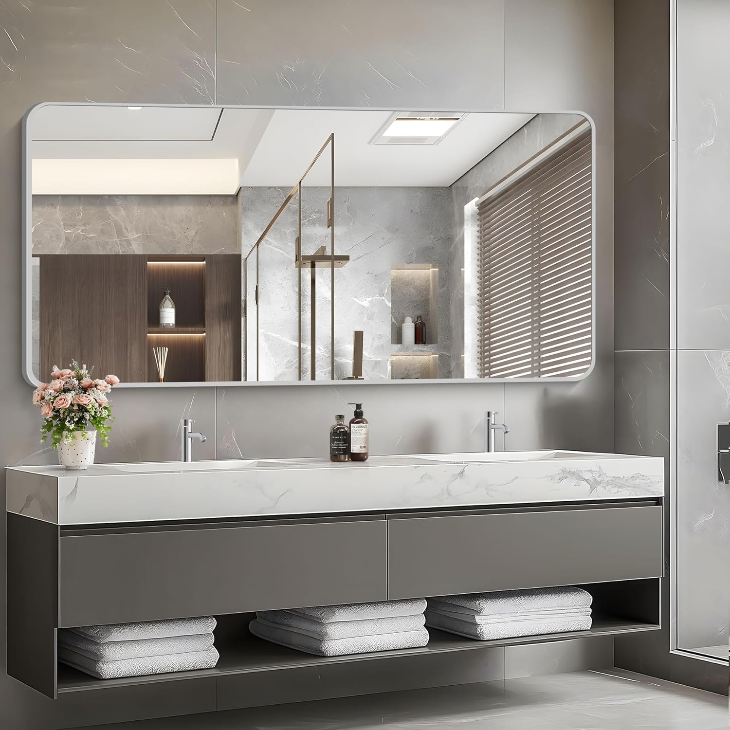- MODERN STYLE SILVER BATHROOM MIRROR: The dimensions of this bathroom mirror is 60 x 30 inch, perfect size for you to get a true and reliable images at multiple angles and distances. Designed minimalist modern style combine practicality and aesthetics. Suitable for anywhere a mirror might be needed. Such as bathroom, cloakroom, dressing room, living room, bedroom, entryway, over sinks. Bring more style and brightness to your home. It's also a wonderful housewarming gift for friends and families.