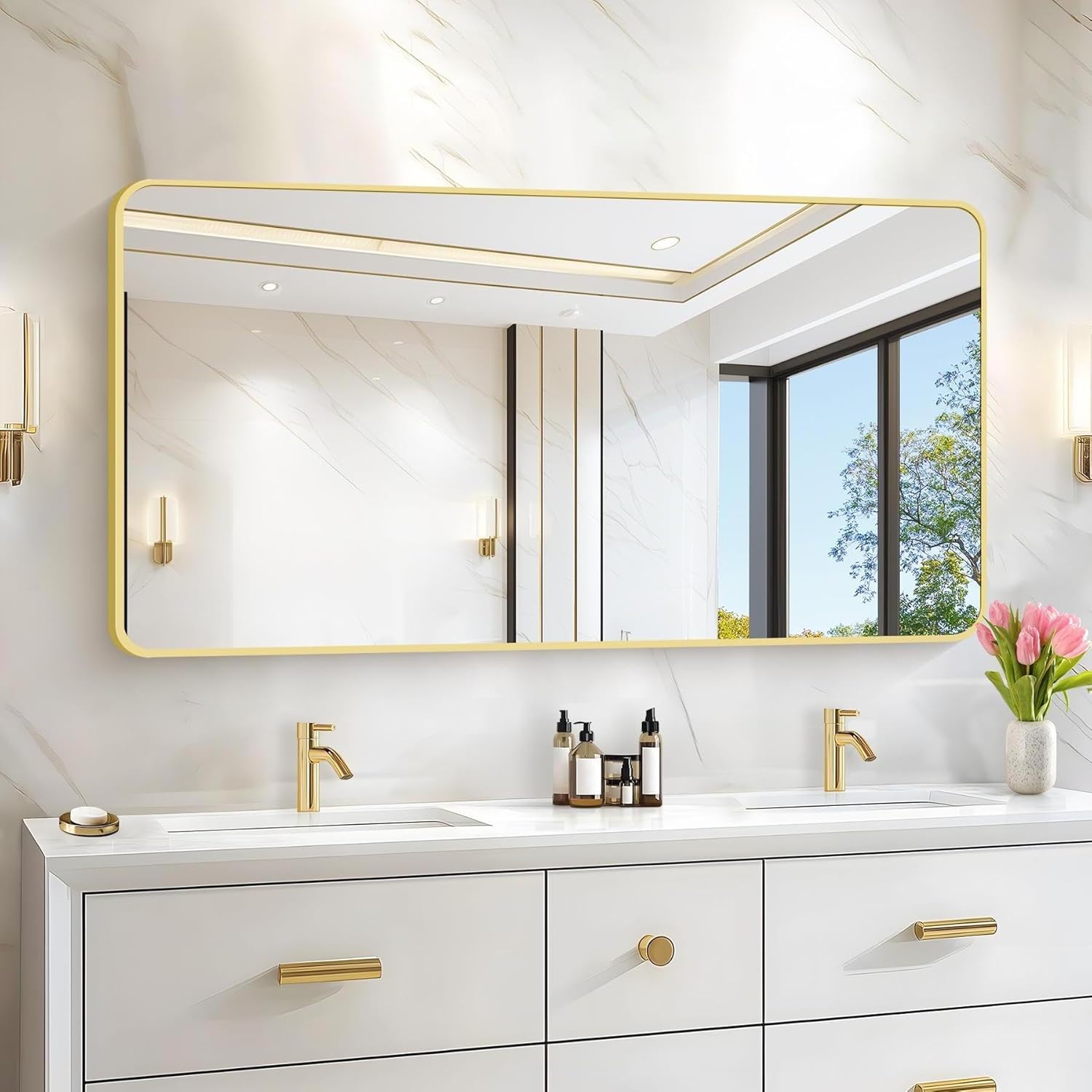55"x30" Gold Bathroom Mirror, Large Rectangle Mirror, Rectangular Wall Mirror, Rounded Corner Vanity Mirror with Aluminum Metal Frame for Bathroom Bedroom Living Room Horizontal/Vertical