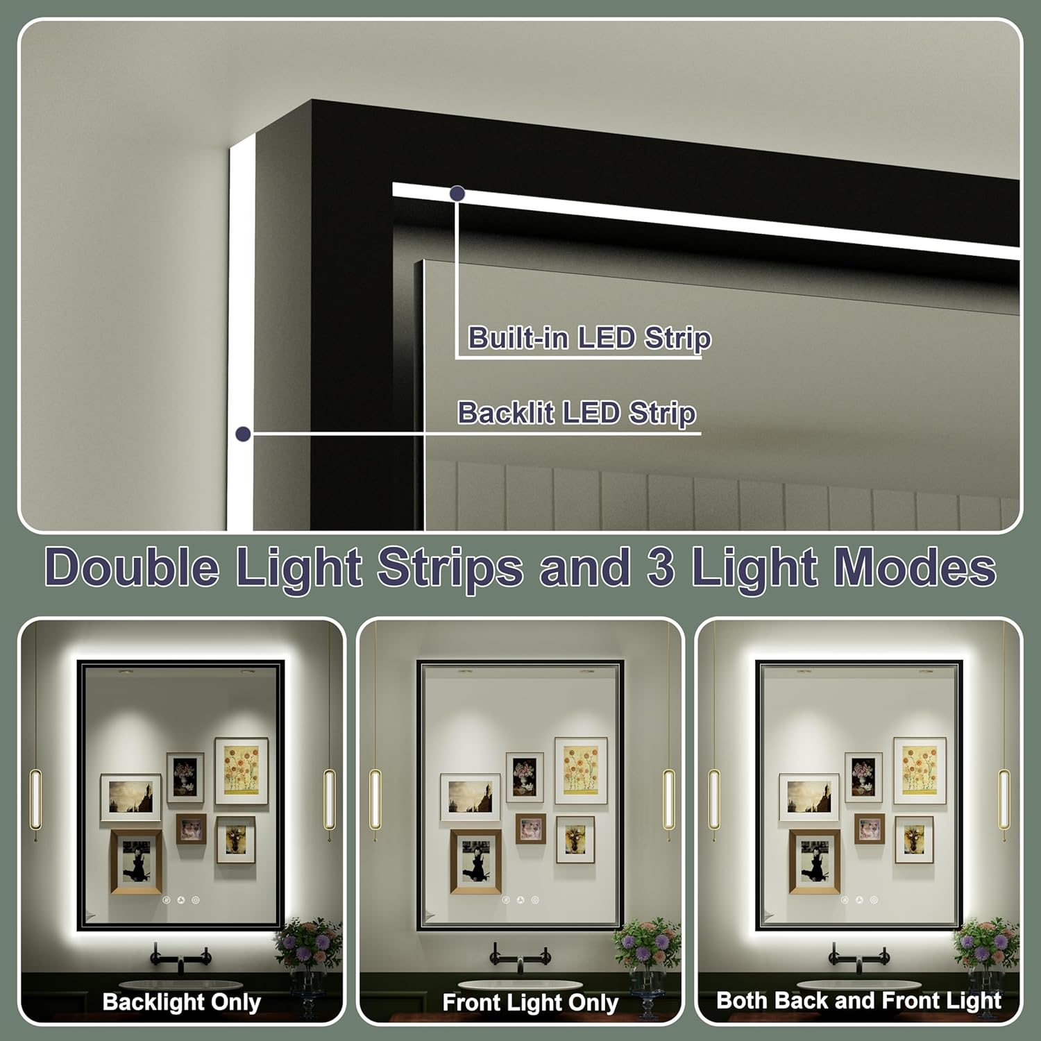 - [Dual LED Strip and Black Frame] JSneijder LED bathroom mirror with built-in front and back dual LED strip for brighter display; Short press the light button to set the front / back / front & back lights; The matte black aluminum frame surrounding makes the mirror more delicate