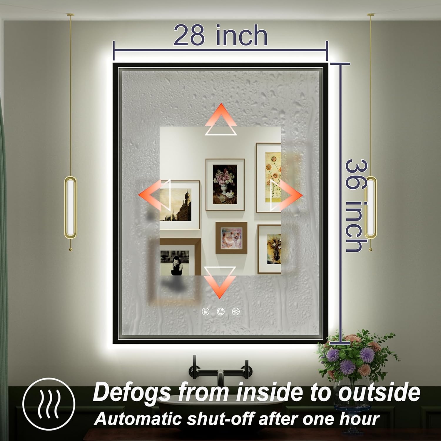 - [Safety Anti Fog Function] The LED mirror is equipped with a built-in defogging heating film. After a few minutes of opening, the fog in the mirror will disperse from the center to both sides, ensuring clear reflection even in humid environments; Automatic shutdown after 1 hour of continuous use, safe and energy-saving