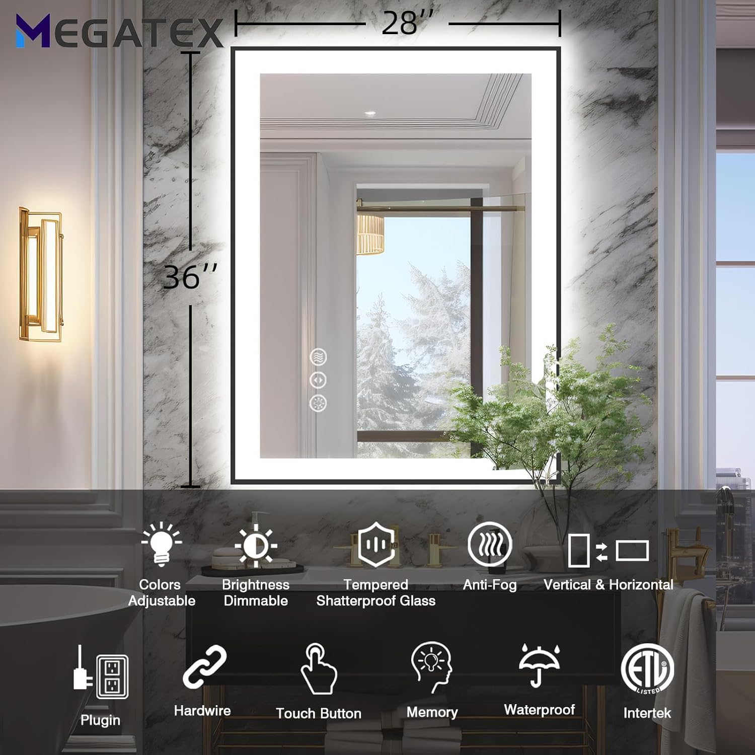 28x36 Lighted Bathroom Mirror, Wall-Mounted, Black Rim Mirror, Vanity(Front and Backlit), Stepless Dimmable CRI90+, Anti-Corrosion, Anti-Rust, Touch Sense, Memory(Horizontal/Vertical)