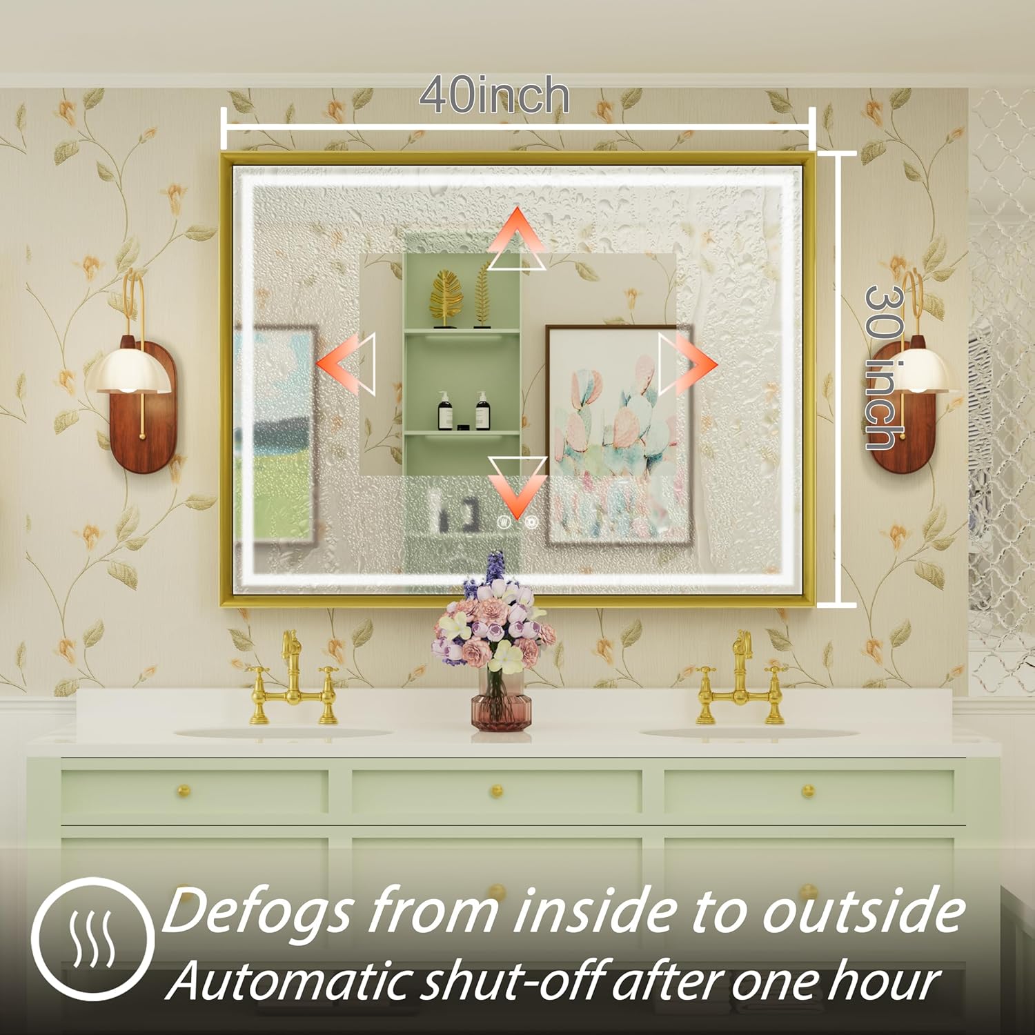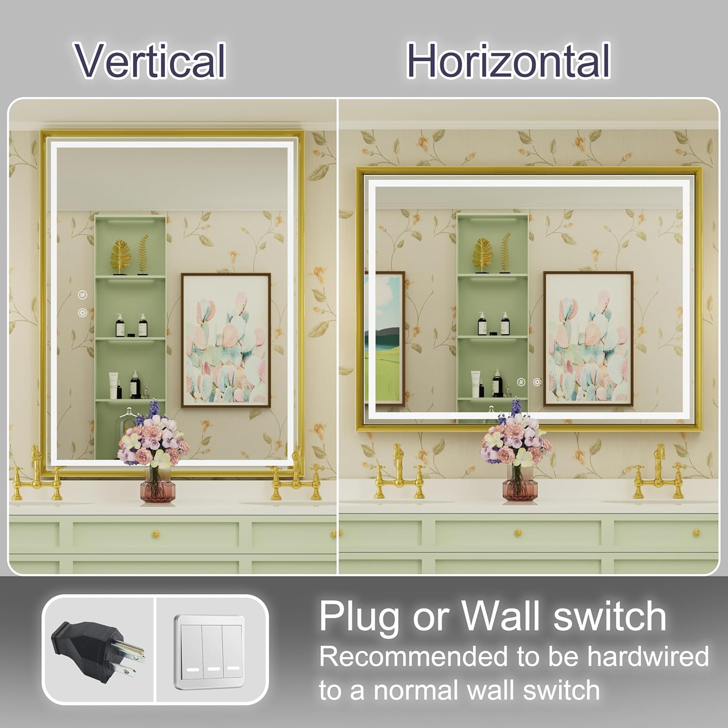 40x30 Inch Gold LED Mirror for Bathroom, 3 Color Temperatures (3000K/4500K/6000K), Anti-Fog, Dimmable Lights, Memory Function, Horizontal/Vertical Wall Mounted