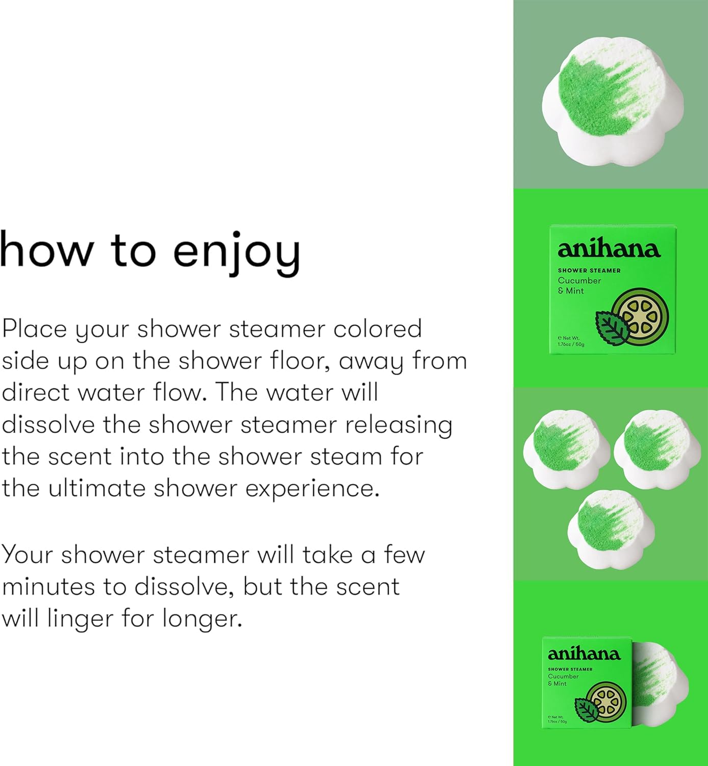 - VIBRANT SCENT: Cool and fresh, the uplifting scent of cucumber and mint makes an Anihana Cucumber & Mint Shower Steamer a great way to start the day