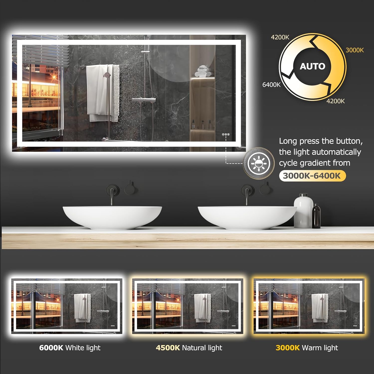 - [3 Colors & Customize Lights Color]: This smart bathroom led mirror is multifunctional. You can switch the color temperature between warm light (3000k), natural light (4200k) and white light (6400k).Long press the button the light will automatically cycle gradient from 3000K-6400K ,just customize the brightness and light color to your preferred level