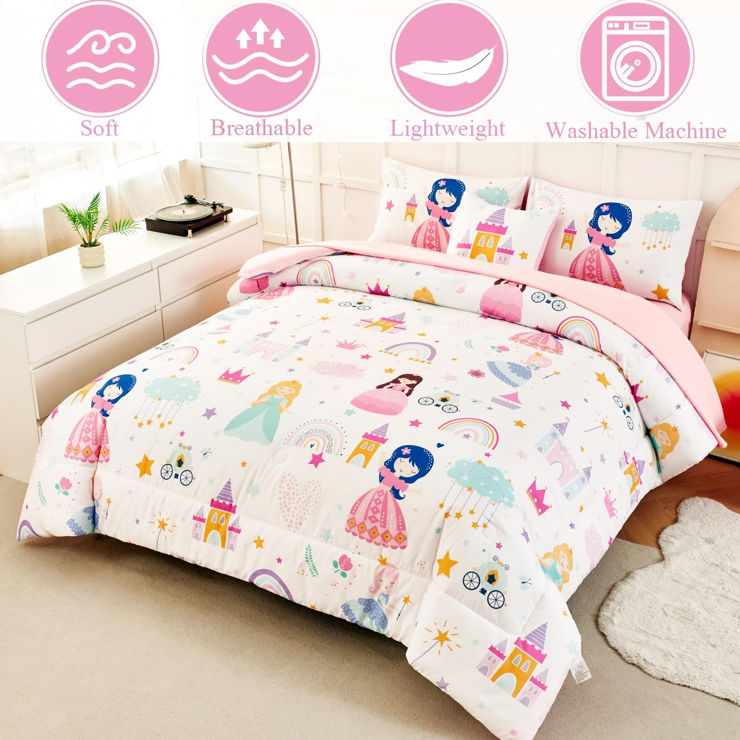- [YEAR ROUND]: This princess castel kids bed in a bag is ideal for year round use, You can use girls bedding set all season. The kids bedding set keep you warm in the winter. You can also use the girls bed set in the summer. Our bedding comforter set can be used directly without duvet cover. Reduce your time on making the bed. As well as you can make a down alternative comforter with your favorite duvet cover.