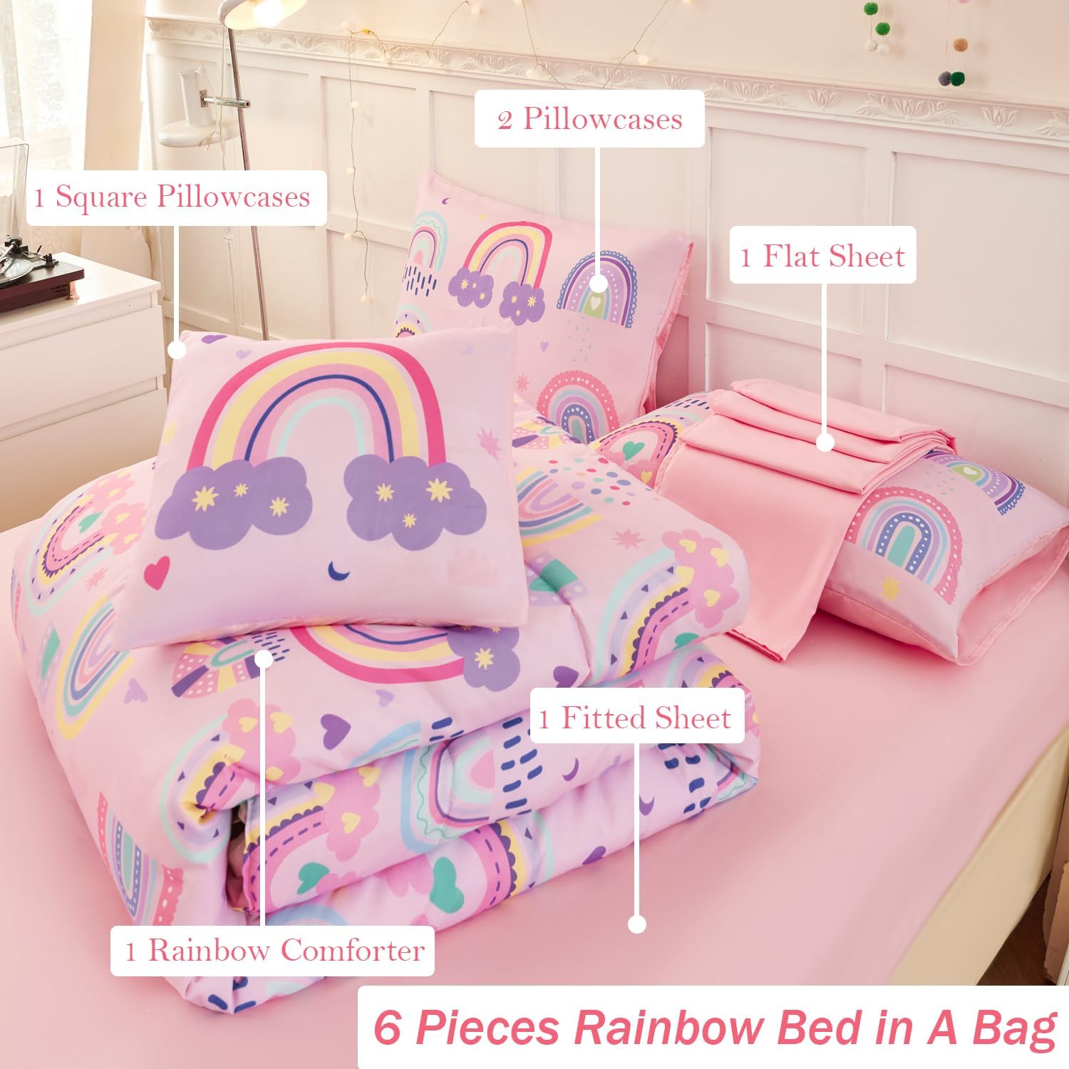 - [6 PIECES KIDS BEDDING SETS QUEEN FOR GIRLS INCLUDING]: 1 girls rainbow comforter: 90'' x 90'', 1 fitted sheet 60'' x 80'' +16'', 1 flat sheet 90'' x 102'', 2 standard pillow cases 20'' x 30'', 1 square pillow cover 18'' x 18''.
