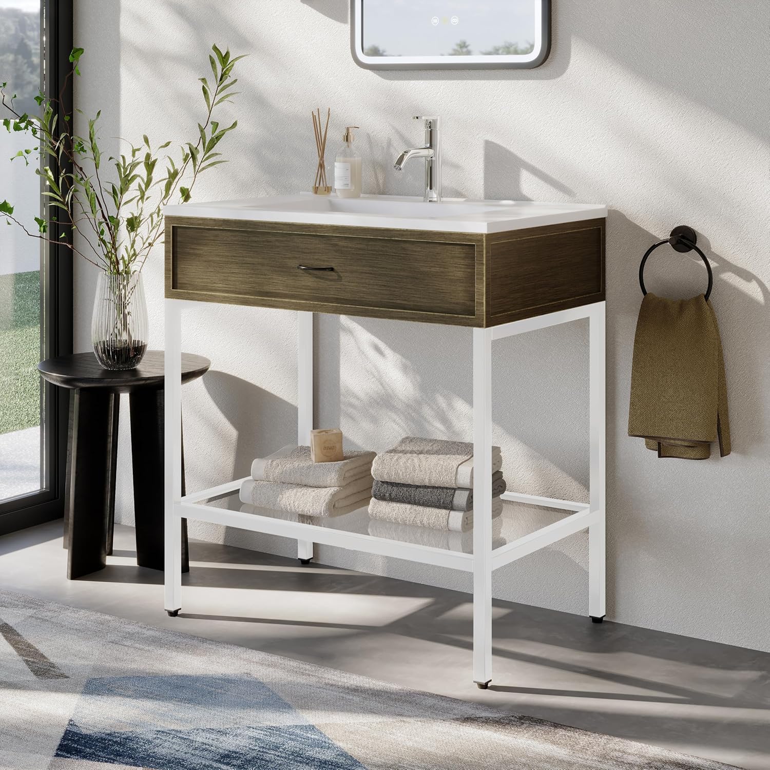 30 Inches Bathroom Vanity with Resin Sink, Single Sink Modern Cabinet Set, Stainless Steel Frame with Tempered Glass Open Shelf, Freestanding Bathroom Storage Cabinet Combo, White